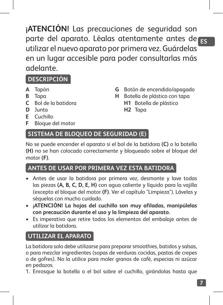 • Antes de usar la batidora por primera vez, desmonte y lave todas las piezas (A, B, C, D, E, H) con agua caliente y líquido para la vajilla (excepto el bloque del motor (F). Ver el capítulo "Limpieza"). Lávelas y séquelas con mucho cuidado. • ¡ATENCIÓN! La hojas del cuchillo son muy afiladas, manipúlelas con precaución durante el uso y la limpieza del aparato. • Es imperativo que retire todos los elementos del embalaje antes de utilizar la batidora.