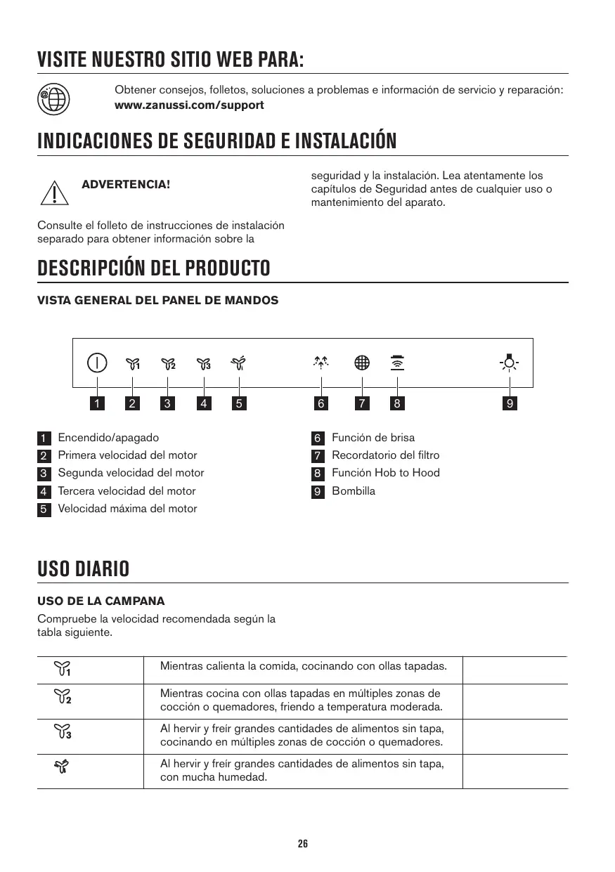 USO DIARIO USO DE LA CAMPANA Compruebe la velocidad recomendada según la tabla siguiente.