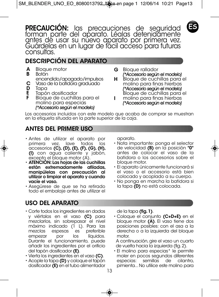(I) con agua caliente y jabón, excepto el bloque motor (A). • ATENCIÓN: Las hojas de las cuchillas están extremadamente afiladas, manipúlelas con precaución al utilizar o limpiar el aparato y cuando vacíe el vaso. • Asegúrese de que se ha retirado todo el embalaje antes de utilizar el