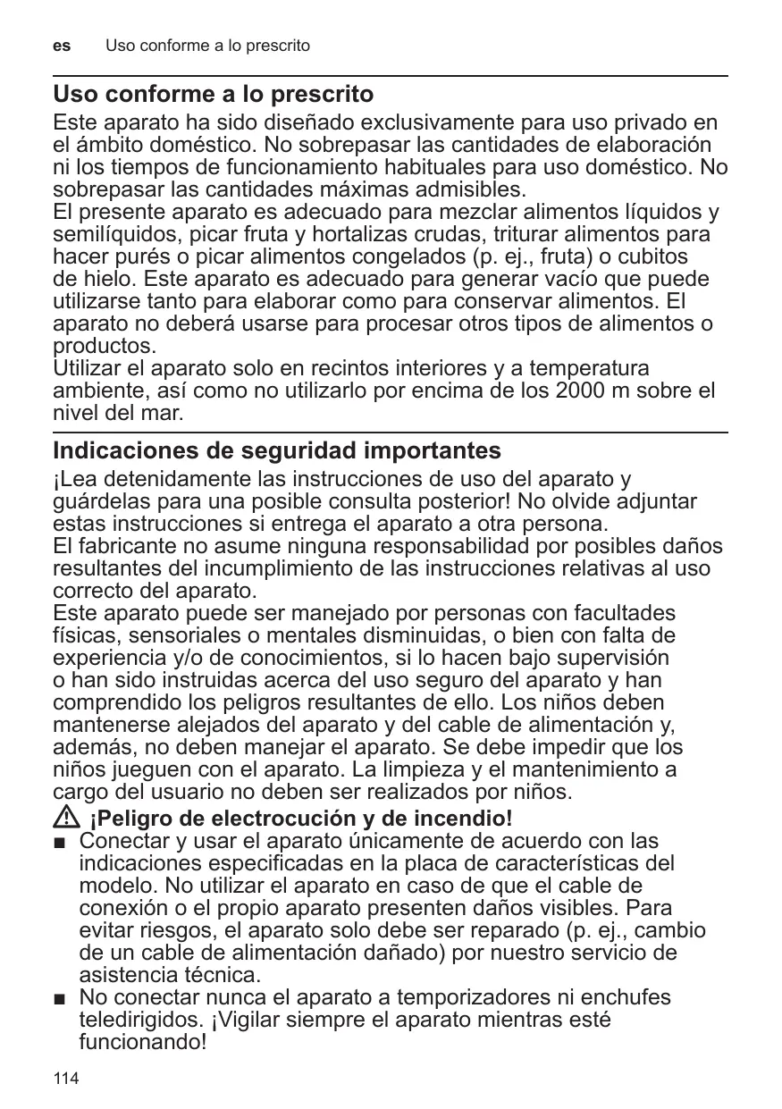 El presente aparato es adecuado para mezclar alimentos líquidos y semilíquidos, picar fruta y hortalizas crudas, triturar alimentos para hacer purés o picar alimentos congelados (p. ej., fruta) o cubitos de hielo. Este aparato es adecuado para generar vacío que puede utilizarse tanto para elaborar como para conservar alimentos. El aparato no deberá usarse para procesar otros tipos de alimentos o productos. Utilizar el aparato solo en recintos interiores y a temperatura ambiente, así como no utilizarlo por encima de los 2000 m sobre el nivel del mar.