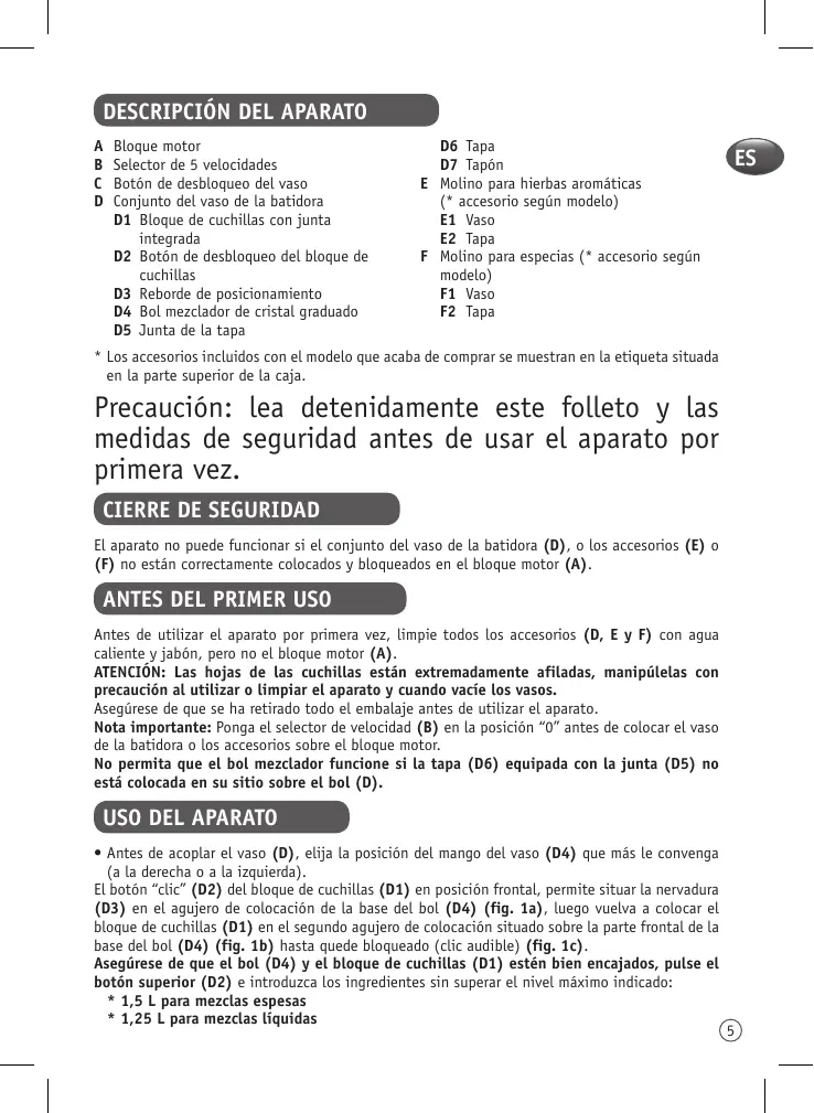 Antes de utilizar el aparato por primera vez, limpie todos los accesorios (D, E y F) con agua caliente y jabón, pero no el bloque motor (A). ATENCIÓN: Las hojas de las cuchillas están extremadamente afiladas, manipúlelas con precaución al utilizar o limpiar el aparato y cuando vacíe los vasos. Asegúrese de que se ha retirado todo el embalaje antes de utilizar el aparato. Nota importante: Ponga el selector de velocidad (B) en la posición “0” antes de colocar el vaso de la batidora o los accesorios sobre el bloque motor. No permita que el bol mezclador funcione si la tapa (D6) equipada con la junta (D5) no está colocada en su sitio sobre el bol (D).