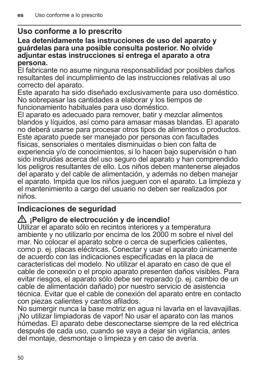 El fabricante no asume ninguna responsabilidad por posibles daños resultantes del incumplimiento de las instrucciones relativas al uso correcto del aparato. Este aparato ha sido diseñado exclusivamente para uso doméstico. No sobrepasar las cantidades a elaborar y los tiempos de funcionamiento habituales para uso doméstico. El aparato es adecuado para remover, batir y mezclar alimentos blandos y líquidos, así como para amasar masas blandas. El aparato no deberá usarse para procesar otros tipos de alimentos o productos. Este aparato puede ser manejado por personas con facultades físicas, sensoriales o mentales disminuidas o bien con falta de experiencia y/o de conocimientos, si lo hacen bajo supervisión o han sido instruidas acerca del uso seguro del aparato y han comprendido los peligros resultantes de ello. Los niños deben mantenerse alejados del aparato y del cable de alimentación, y además no deben manejar el aparato. Impida que los niños jueguen con el aparato. La limpieza y el mantenimiento a cargo del usuario no deben ser realizados por niños.
