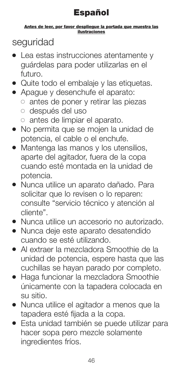 Quite todo el embalaje y las etiquetas. Apague y desenchufe el aparato: G antes de poner y retirar las piezas G después del uso G antes de limpiar el aparato. No permita que se mojen la unidad de potencia, el cable o el enchufe. Mantenga las manos y los utensilios, aparte del agitador, fuera de la copa cuando esté montada en la unidad de potencia. Nunca utilice un aparato dañado. Para solicitar que lo revisen o lo reparen: consulte “servicio técnico y atención al cliente”. Nunca utilice un accesorio no autorizado. Nunca deje este aparato desatendido cuando se esté utilizando. Al extraer la mezcladora Smoothie de la unidad de potencia, espere hasta que las cuchillas se hayan parado por completo. Haga funcionar la mezcladora Smoothie únicamente con la tapadera colocada en su sitio. Nunca utilice el agitador a menos que la tapadera esté fijada a la copa. Esta unidad también se puede utilizar para hacer sopa pero mezcle solamente ingredientes fríos. 46