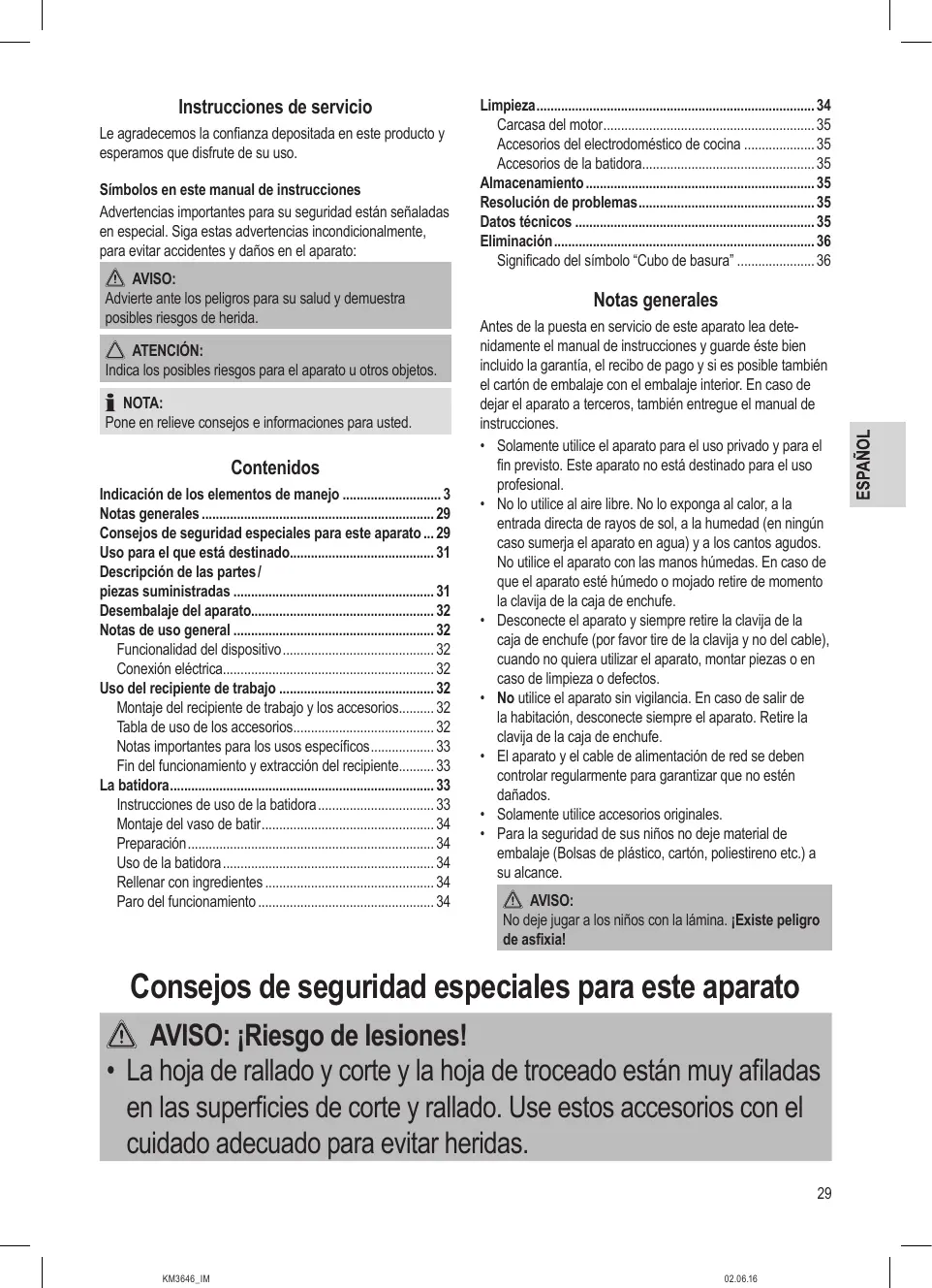 Indicación de los elementos de manejo 3 Notas generales 29 Consejos de seguridad especiales para este aparato.... 29 Uso para el que está destinado 31 Descripción de las partes / piezas suministradas 31 Desembalaje del aparato 32 Notas de uso general 32 Funcionalidad del dispositivo 32 Conexión eléctrica 32 Uso del recipiente de trabajo 32 Montaje del recipiente de trabajo y los accesorios 32 Tabla de uso de los accesorios 32 Notas importantes para los usos específicos 33 Fin del funcionamiento y extracción del recipiente 33 La batidora 33 Instrucciones de uso de la batidora 33 Montaje del vaso de batir 34 Preparación 34 Uso de la batidora 34 Rellenar con ingredientes 34 Paro del funcionamiento 34