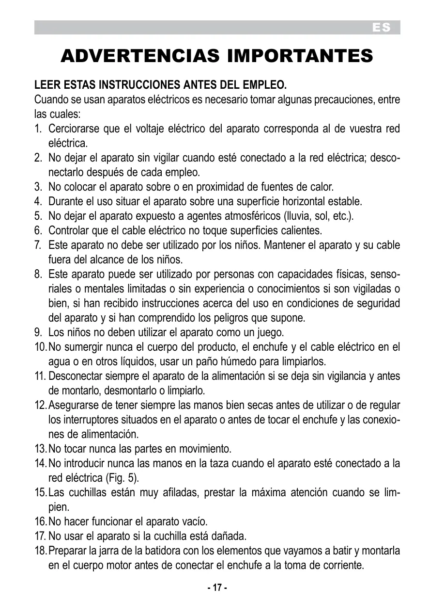 ADVERTENCIAS IMPORTANTES LEER ESTAS INSTRUCCIONES ANTES DEL EMPLEO. Cuando se usan aparatos eléctricos es necesario tomar algunas precauciones, entre las cuales: 1. Cerciorarse que el voltaje eléctrico del aparato corresponda al de vuestra red eléctrica. 2. No dejar el aparato sin vigilar cuando esté conectado a la red eléctrica; desconectarlo después de cada empleo. 3. No colocar el aparato sobre o en proximidad de fuentes de calor. 4. Durante el uso situar el aparato sobre una superficie horizontal estable. 5. No dejar el aparato expuesto a agentes atmosféricos (lluvia, sol, etc.). 6. Controlar que el cable eléctrico no toque superficies calientes. 7. Este aparato no debe ser utilizado por los niños. Mantener el aparato y su cable fuera del alcance de los niños. 8. Este aparato puede ser utilizado por personas con capacidades físicas, sensoriales o mentales limitadas o sin experiencia o conocimientos si son vigiladas o bien, si han recibido instrucciones acerca del uso en condiciones de seguridad del aparato y si han comprendido los peligros que supone. 9. Los niños no deben utilizar el aparato como un juego. 10. No sumergir nunca el cuerpo del producto, el enchufe y el cable eléctrico en el agua o en otros líquidos, usar un paño húmedo para limpiarlos. 11. Desconectar siempre el aparato de la alimentación si se deja sin vigilancia y antes de montarlo, desmontarlo o limpiarlo. 12. Asegurarse de tener siempre las manos bien secas antes de utilizar o de regular los interruptores situados en el aparato o antes de tocar el enchufe y las conexiones de alimentación. 13. No tocar nunca las partes en movimiento. 14. No introducir nunca las manos en la taza cuando el aparato esté conectado a la red eléctrica (Fig. 5). 15. Las cuchillas están muy afiladas, prestar la máxima atención cuando se limpien. 16. No hacer funcionar el aparato vacío. 17. No usar el aparato si la cuchilla está dañada. 18. Preparar la jarra de la batidora con los elementos que vayamos a batir y montarla en el cuerpo motor antes de conectar el enchufe a la toma de corriente. - 17 -
