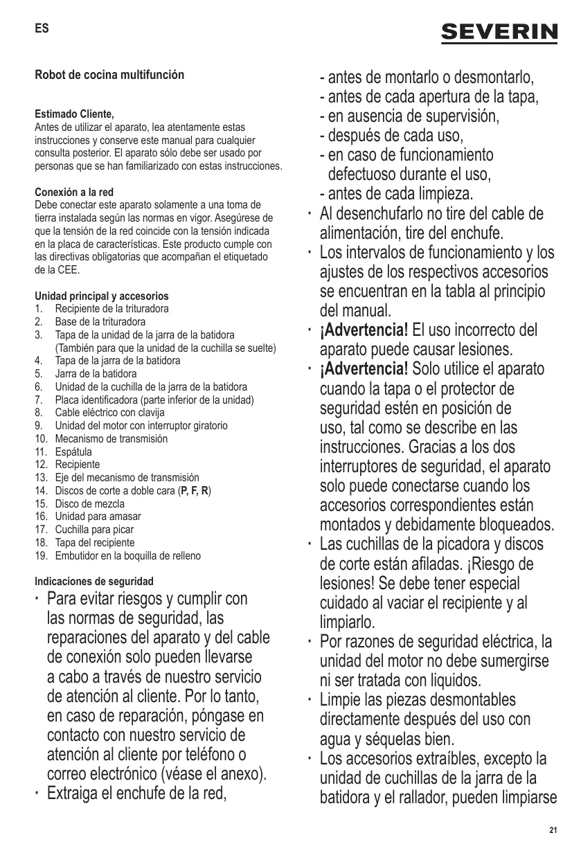 Estimado Cliente, Antes de utilizar el aparato, lea atentamente estas instrucciones y conserve este manual para cualquier consulta posterior. El aparato sólo debe ser usado por personas que se han familiarizado con estas instrucciones. Conexión a la red Debe conectar este aparato solamente a una toma de tierra instalada según las normas en vigor. Asegúrese de que la tensión de la red coincide con la tensión indicada en la placa de características. Este producto cumple con las directivas obligatorias que acompañan el etiquetado de la CEE. Unidad principal y accesorios 1. Recipiente de la trituradora 2. Base de la trituradora 3. Tapa de la unidad de la jarra de la batidora (También para que la unidad de la cuchilla se suelte) 4. Tapa de la jarra de la batidora 5. Jarra de la batidora 6. Unidad de la cuchilla de la jarra de la batidora 7. Placa identificadora (parte inferior de la unidad) 8. Cable eléctrico con clavija 9. Unidad del motor con interruptor giratorio 10. Mecanismo de transmisión 11. Espátula 12. Recipiente 13. Eje del mecanismo de transmisión 14. Discos de corte a doble cara (P, F, R) 15. Disco de mezcla 16. Unidad para amasar 17. Cuchilla para picar 18. Tapa del recipiente 19. Embutidor en la boquilla de relleno