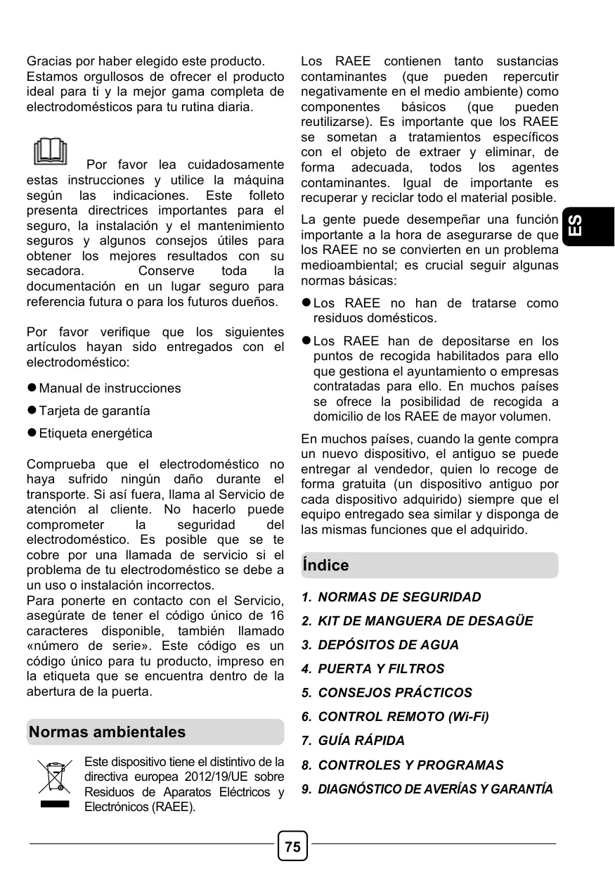 1. NORMAS DE SEGURIDAD 2. KIT DE MANGUERA DE DESAGÜE 3. DEPÓSITOS DE AGUA 4. PUERTA Y FILTROS 5. CONSEJOS PRÁCTICOS 6. CONTROL REMOTO (Wi-Fi)