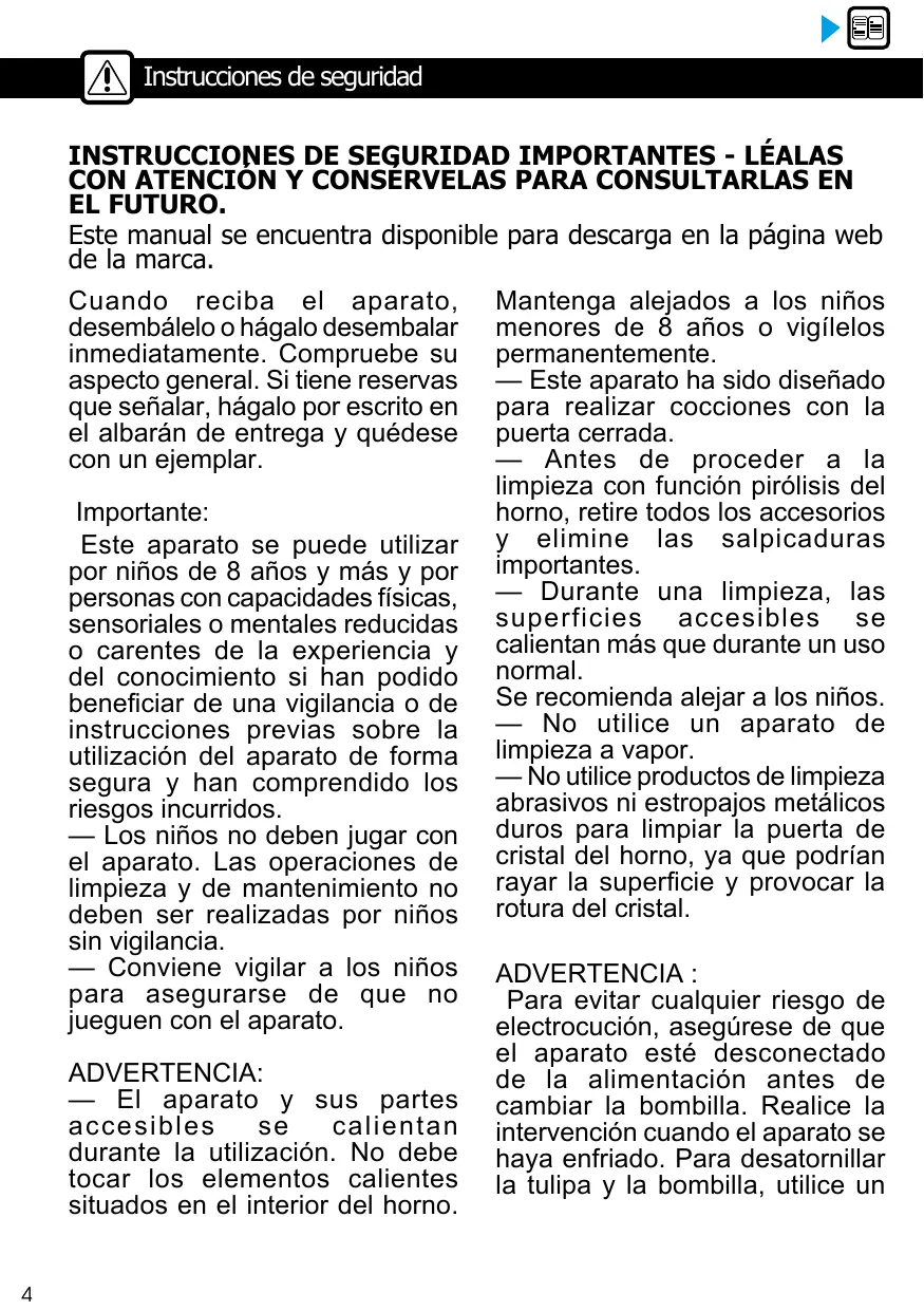 INSTRUCCIONES DE SEGURIDAD IMPORTANTES - LÉALAS CON ATENCIÓN Y CONSÉRVELAS PARA CONSULTARLAS EN EL FUTURO. Este manual se encuentra disponible para descarga en la página web de la marca. Cuando reciba el aparato, desembálelo o hágalo desembalar inmediatamente. Compruebe su aspecto general. Si tiene reservas que señalar, hágalo por escrito en el albarán de entrega y quédese con un ejemplar. Importante: Este aparato se puede utilizar por niños de 8 años y más y por personas con capacidades físicas, sensoriales o mentales reducidas o carentes de la experiencia y del conocimiento si han podido beneficiar de una vigilancia o de instrucciones previas sobre la utilización del aparato de forma segura y han comprendido los riesgos incurridos. — Los niños no deben jugar con el aparato. Las operaciones de limpieza y de mantenimiento no deben ser realizadas por niños sin vigilancia. — Conviene vigilar a los niños para asegurarse de que no jueguen con el aparato. ADVERTENCIA: — El aparato y sus partes accesibles se calientan durante la utilización. No debe tocar los elementos calientes situados en el interior del horno. 4