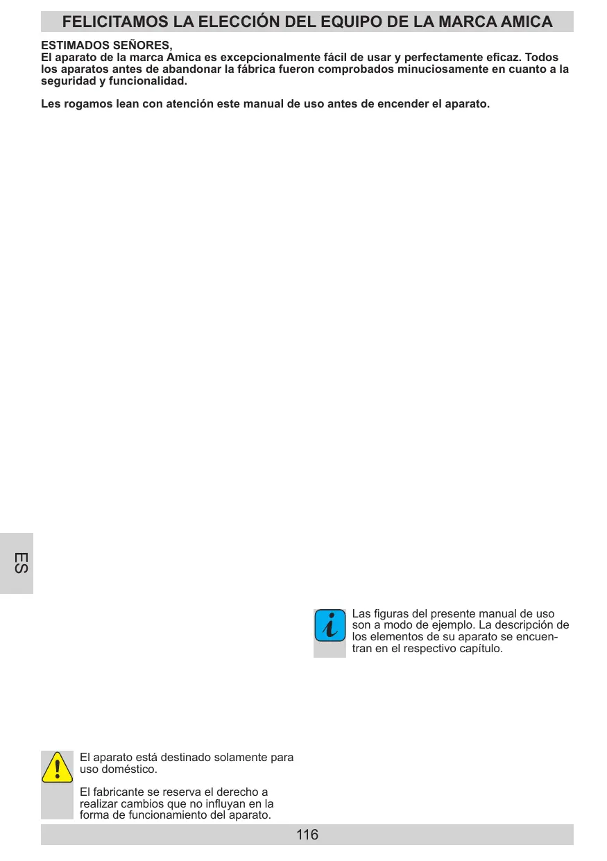 El aparato de la marca Amica es excepcionalmente fácil de usar y perfectamente eficaz. Todos los aparatos antes de abandonar la fábrica fueron comprobados minuciosamente en cuanto a la seguridad y funcionalidad. Les rogamos lean con atención este manual de uso antes de encender el aparato.