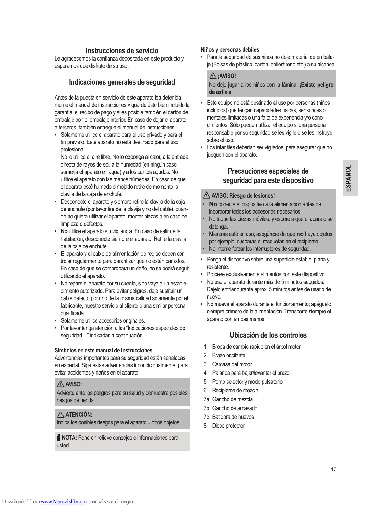 AVISO: Riesgo de lesiones! • No conecte el dispositivo a la alimentación antes de incorporar todos los accesorios necesarios. • No toque las piezas móviles, y espere a que el aparato se detenga. • Mientras esté en uso, asegúrese de que no haya objetos, por ejemplo, cucharas o rasquetas en el recipiente. • No intente forzar los interruptores de seguridad. •• Ponga el dispositivo sobre una superficie estable, plana y resistente. •• Procese exclusivamente alimentos con este dispositivo. •• No use el aparato durante más de 5 minutos seguidos. Déjelo enfriar durante aprox. 5 minutos antes de usarlo de nuevo. •• No mueva el aparato durante el funcionamiento; apáguelo siempre primero de la alimentación. Transporte siempre el aparato con ambas manos.