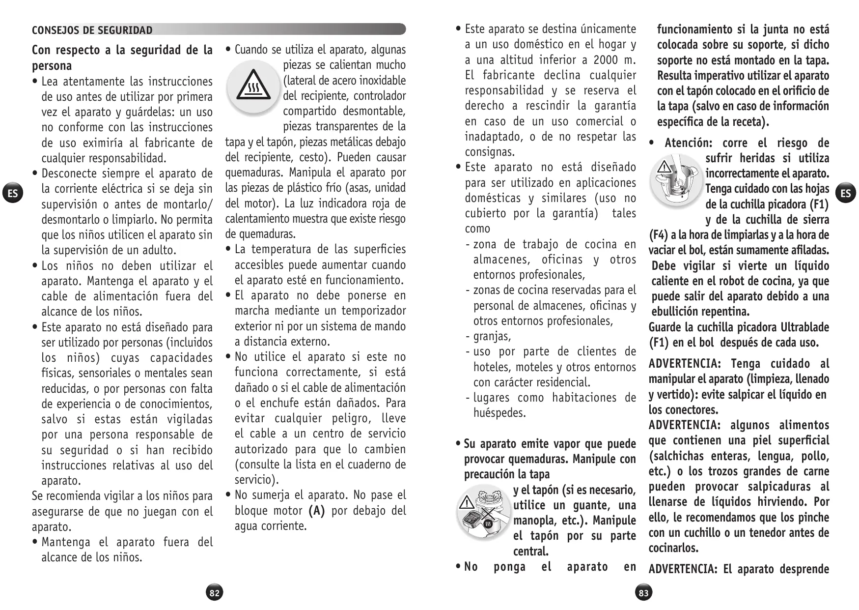 ADVERTENCIA: La superficie del elemento calefactor presenta un calor residual después del uso. Asegúrese de no tocar más que las asas de su producto (pulsador D2, asa de la tapa E2 y el tapón E1) mientras calienta y hasta su completo enfriamiento. Consulte el manual de instrucciones para ajustar la velocidad y el tiempo de funcionamiento de cada accesorio y cada programa. Consulte el manual de instrucciones para saber cómo ensamblar y montar los accesorios en el aparato Consulte el manual de instrucciones para saber cómo limpiar y mantener el aparato. Siga siempre las instrucciones de limpieza para limpiar el aparato: • Desenchufe el aparato. • No limpie el aparato en caliente. • Limpie el aparato con un paño o una esponja húmeda. • Nunca sumerja el aparato en agua ni bajo el agua corriente SOLO MERCADOS EUROPEOS • Mantenga el aparato y su cable fuera del alcance de los niños de menos de 8 años. Los niños no deben utilizar el aparato como un juguete. • Este aparato puede ser utilizado por personas con capacidades físicas, 84