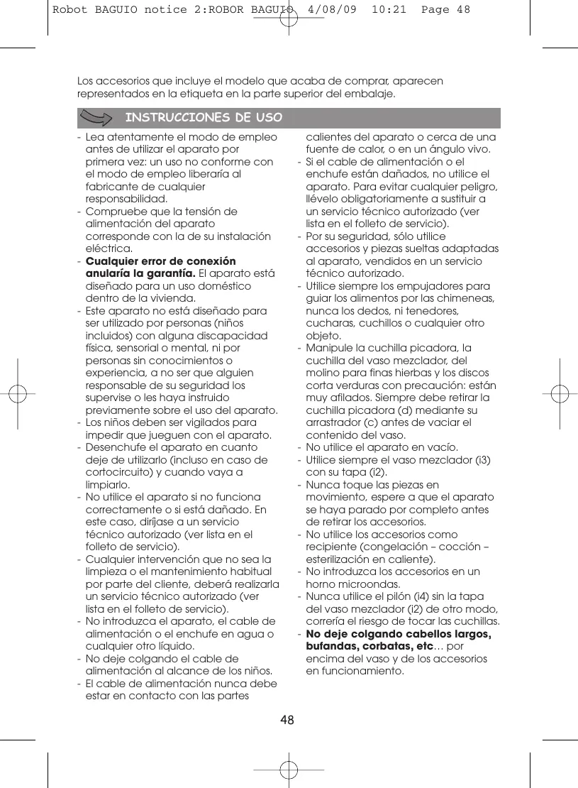 Si el cable de alimentación o el enchufe están dañados, no utilice el aparato. Para evitar cualquier peligro, llévelo obligatoriamente a sustituir a un servicio técnico autorizado (ver lista en el folleto de servicio). Por su seguridad, sólo utilice accesorios y piezas sueltas adaptadas al aparato, vendidos en un servicio técnico autorizado. Utilice siempre los empujadores para guiar los alimentos por las chimeneas, nunca los dedos, ni tenedores, cucharas, cuchillos o cualquier otro objeto. Manipule la cuchilla picadora, la cuchilla del vaso mezclador, del molino para finas hierbas y los discos corta verduras con precaución: están muy afilados. Siempre debe retirar la cuchilla picadora (d) mediante su arrastrador (c) antes de vaciar el contenido del vaso. No utilice el aparato en vacío. Utilice siempre el vaso mezclador (i3) con su tapa (i2). Nunca toque las piezas en movimiento, espere a que el aparato se haya parado por completo antes de retirar los accesorios. No utilice los accesorios como recipiente (congelación – cocción – esterilización en caliente). No introduzca los accesorios en un horno microondas. Nunca utilice el pilón (i4) sin la tapa del vaso mezclador (i2) de otro modo, correría el riesgo de tocar las cuchillas. No deje colgando cabellos largos, bufandas, corbatas, etc… por encima del vaso y de los accesorios en funcionamiento.