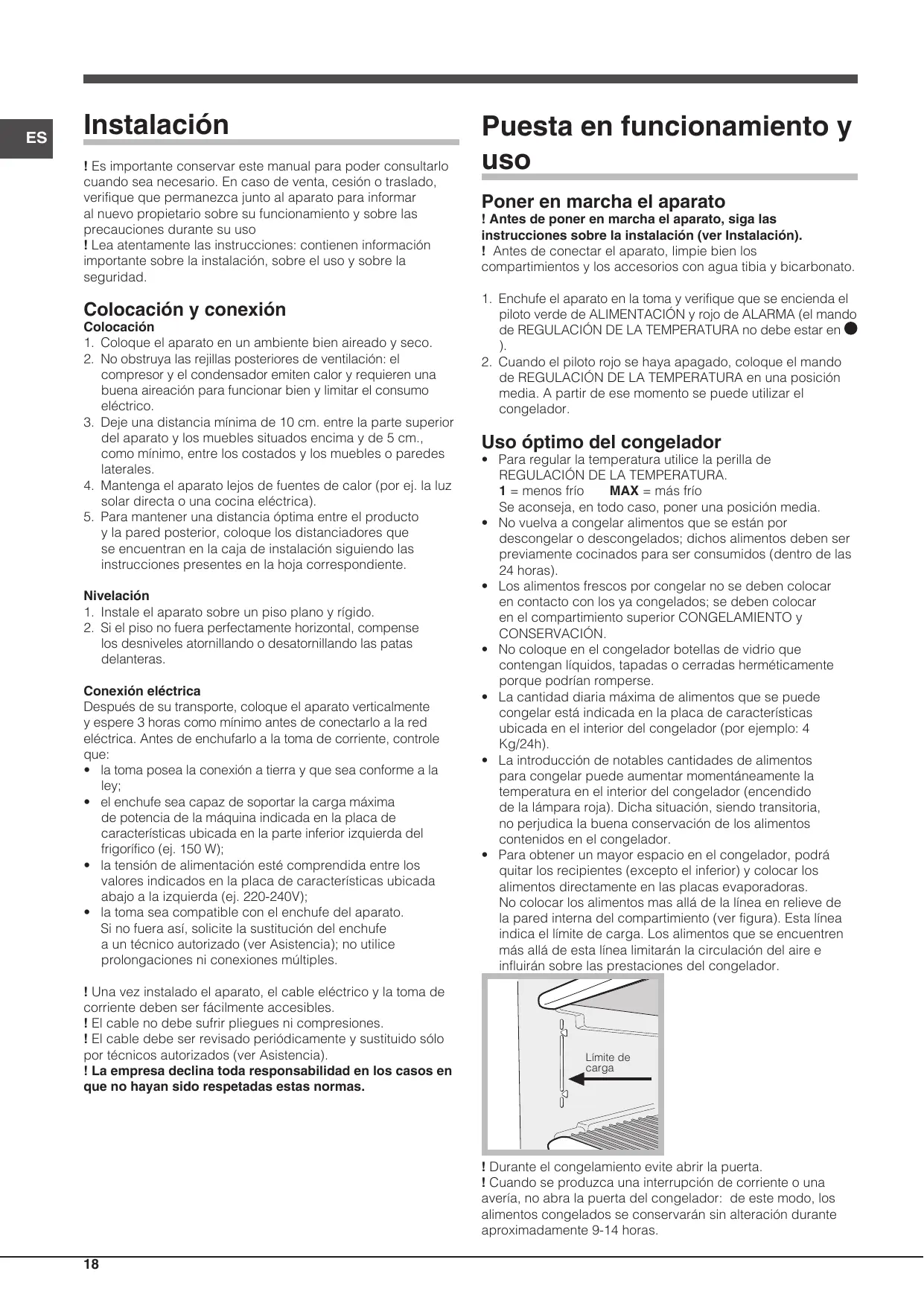 ! Cuando se produzca una interrupción de corriente o una avería, no abra la puerta del congelador: de este modo, los alimentos congelados se conservarán sin alteración durante aproximadamente 9-14 horas.