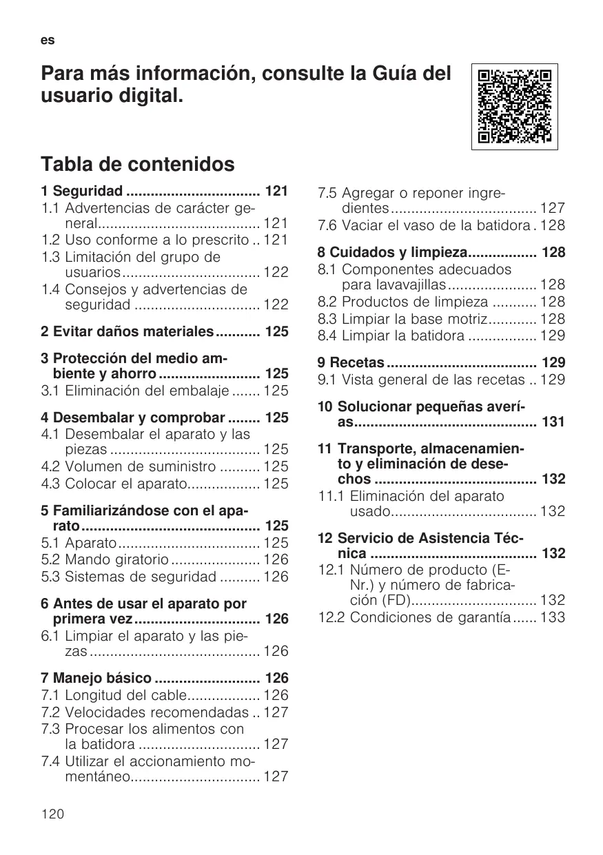 Tabla de contenidos 1 Seguridad 121 1.1 Advertencias de carácter general 121 1.2 Uso conforme a lo prescrito .. 121 1.3 Limitación del grupo de usuarios 122 1.4 Consejos y advertencias de seguridad 122 2 Evitar daños materiales 125 3 Protección del medio ambiente y ahorro 125 3.1 Eliminación del embalaje 125 4 Desembalar y comprobar 125 4.1 Desembalar el aparato y las piezas 125 4.2 Volumen de suministro 125 4.3 Colocar el aparato 125 5 Familiarizándose con el aparato 125 5.1 Aparato 125 5.2 Mando giratorio 126 5.3 Sistemas de seguridad 126 6 Antes de usar el aparato por primera vez 126 6.1 Limpiar el aparato y las piezas 126 7 Manejo básico 126 7.1 Longitud del cable 126 7.2 Velocidades recomendadas .. 127 7.3 Procesar los alimentos con la batidora 127 7.4 Utilizar el accionamiento momentáneo 127 120