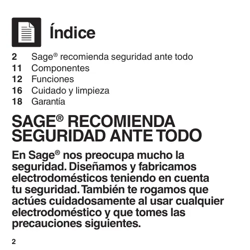 En Sage® nos preocupa mucha la seguidad. Diseñamos y fabricamos electrodomésticos teniendo en cuenta tu seguidad. también te rogamos que actues cuidadosamente al usarrialquier electrodoméstico y que tomes las precauciones sugientes.
