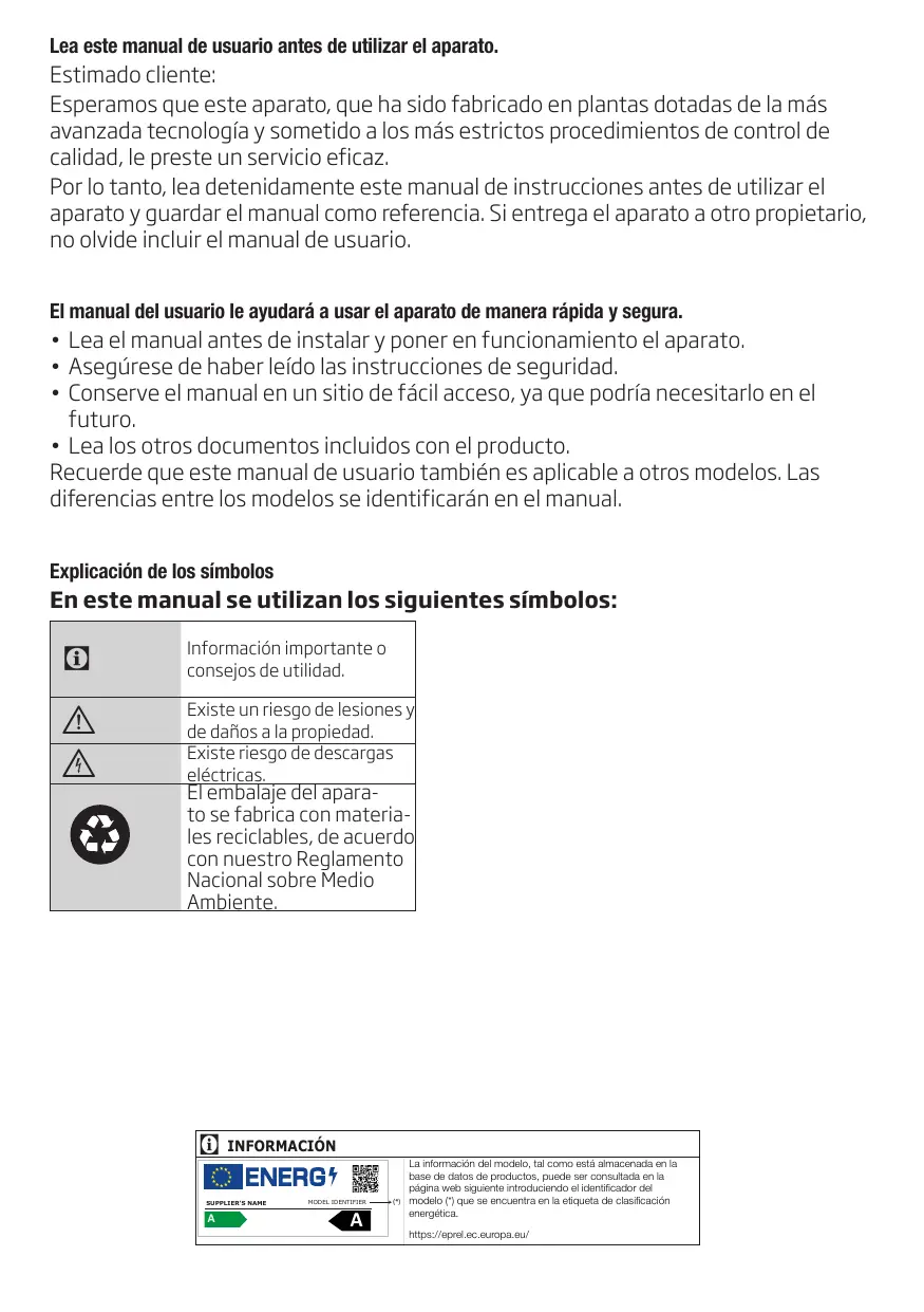 • Asegúrese de haber leído las instrucciones de seguridad. • Conserve el manual en un sitio de fácil acceso, ya que podría necesitarlo en el futuro. • Lea los otros documentos incluidos con el producto. Recuerde que este manual de usuario también es aplicable a otros modelos. Las diferencias entre los modelos se identificarán en el manual. Explicación de los símbolos