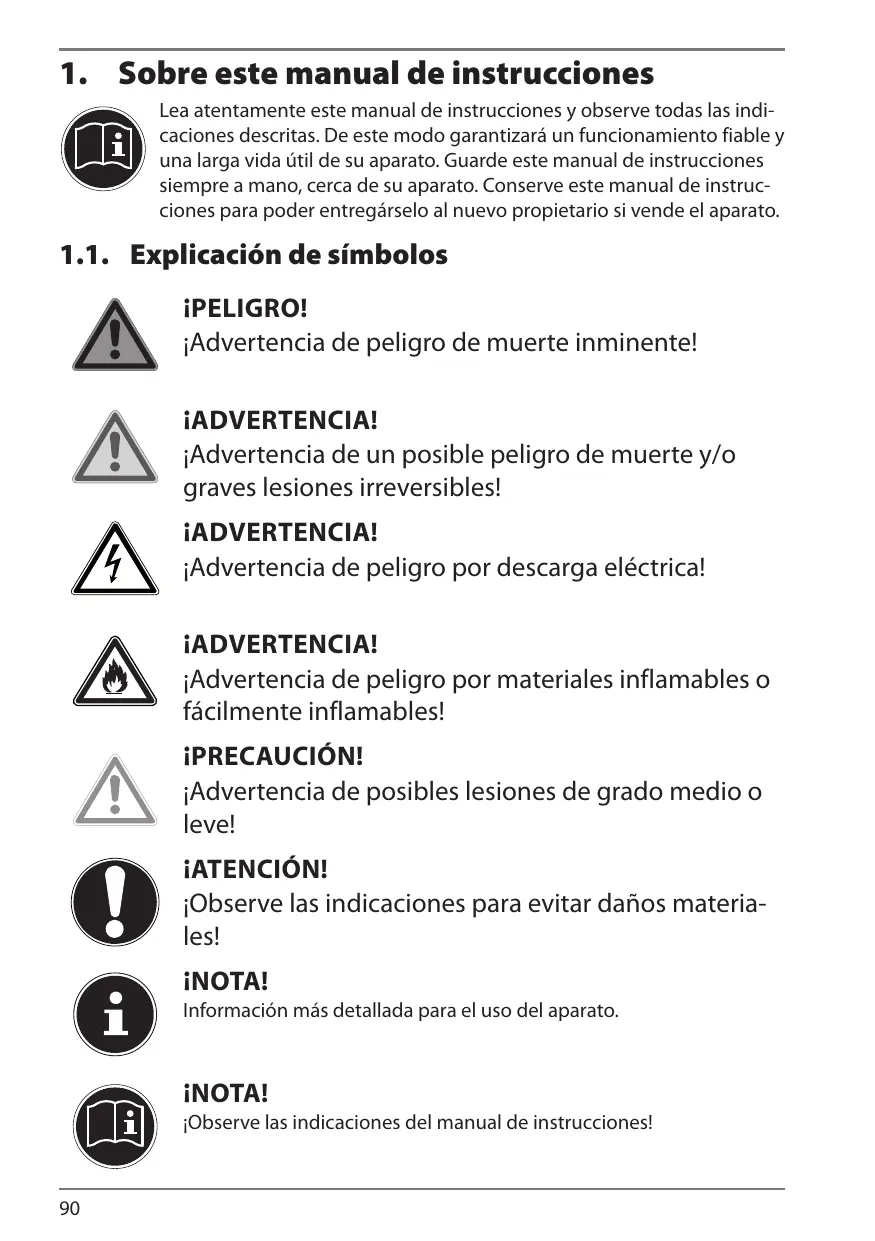 ¡PELIGRO! ¡Advertencia de peligro de muerte inminente! ¡ADVERTENCIA! ¡Advertencia de un posible peligro de muerte y/o graves lesiones irreversibles! ¡ADVERTENCIA! ¡Advertencia de peligro por descarga eléctrica! ¡ADVERTENCIA! ¡Advertencia de peligro por materiales inflamables o fácilmente inflamables! ¡PRECAUCIÓN! ¡Advertencia de posibles lesiones de grado medio o leve! ¡ATENCIÓN! ¡Observe las indicaciones para evitar daños materiales! ¡NOTA! Información más detallada para el uso del aparato.