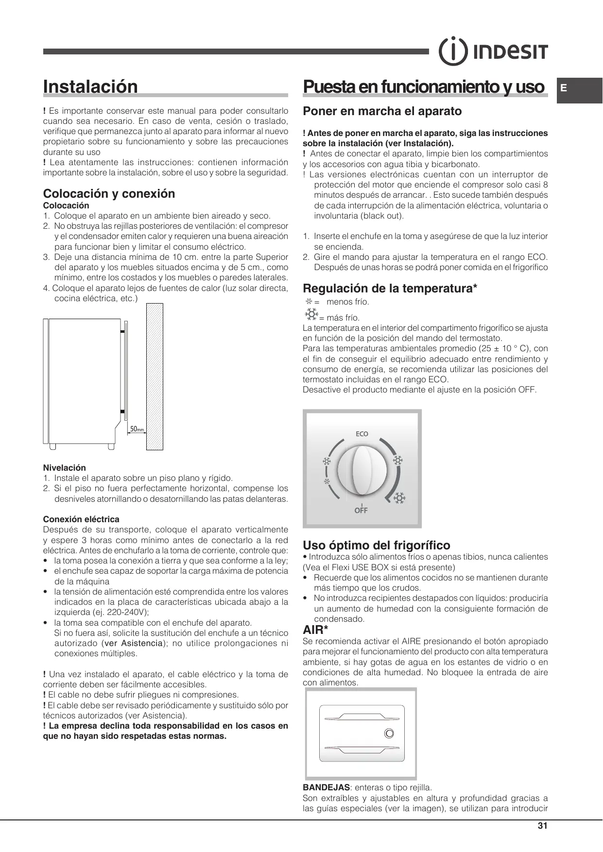 Se recomienda activar el AIRE presionando el botón apropiado para mejorar el funcionamiento del producto con alta temperatura ambiente, si hay gotas de agua en los estantes de vidrio o en condiciones de alta humedad. No bloquee la entrada de aire con alimentos.