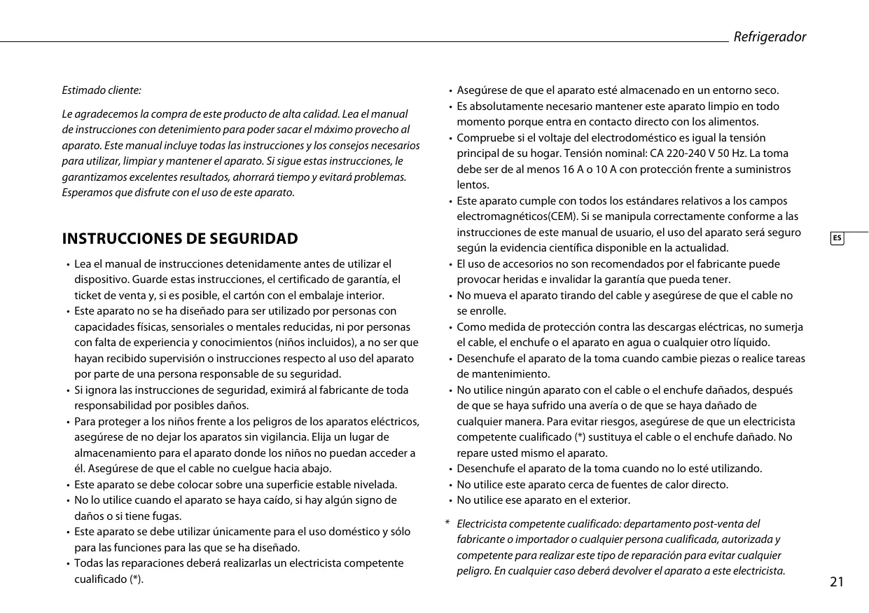 • Es absolutamente necesario mantener este aparato limpio en todo momento porque entra en contacto directo con los alimentos. • Compruebe si el voltaje del electrodoméstico es igual la tensión principal de su hogar. Tensión nominal: CA 220-240 V 50 Hz. La toma debe ser de al menos 16 A o 10 A con protección frente a suministros lentos. • Este aparato cumple con todos los estándares relativos a los campos electromagnéticos(CEM). Si se manipula correctamente conforme a las instrucciones de este manual de usuario, el uso del aparato será seguro según la evidencia científica disponible en la actualidad. • El uso de accesorios no son recomendados por el fabricante puede provocar heridas e invalidar la garantía que pueda tener. • No mueva el aparato tirando del cable y asegúrese de que el cable no se enrolle. • Como medida de protección contra las descargas eléctricas, no sumerja el cable, el enchufe o el aparato en agua o cualquier otro líquido. • Desenchufe el aparato de la toma cuando cambie piezas o realice tareas de mantenimiento. • No utilice ningún aparato con el cable o el enchufe dañados, después de que se haya sufrido una avería o de que se haya dañado de cualquier manera. Para evitar riesgos, asegúrese de que un electricista competente cualificado (*) sustituya el cable o el enchufe dañado. No repare usted mismo el aparato. • Desenchufe el aparato de la toma cuando no lo esté utilizando. • No utilice este aparato cerca de fuentes de calor directo. • No utilice ese aparato en el exterior. * Electricista competente cualificado: departamento post-venta del fabricante o importador o cualquier persona cualificada, autorizada y competente para realizar este tipo de reparación para evitar cualquier peligro. En cualquier caso deberá devolver el aparato a este electricista.