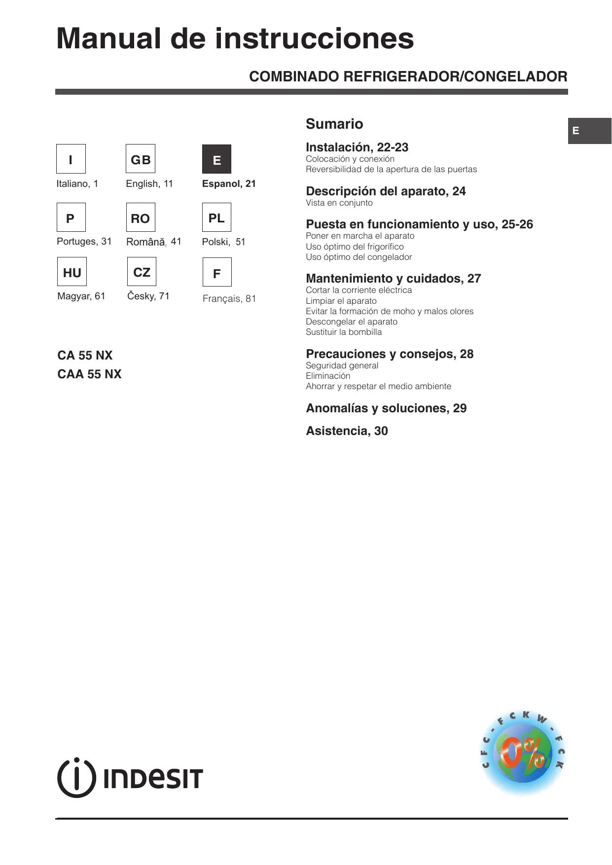 MANUAL DE USUARIO CAA55NX1 - CAA 55 NX INDESIT