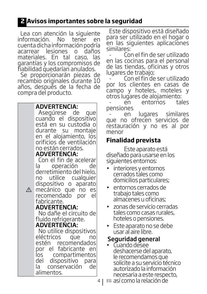 4 Finalidad prevista 4 Productos equipados con dispensador de agua: 8 8 eliminación del aparato al final de su 8 ...9 9 Advertencia sobre la seguridad de la salud 9 ...9
