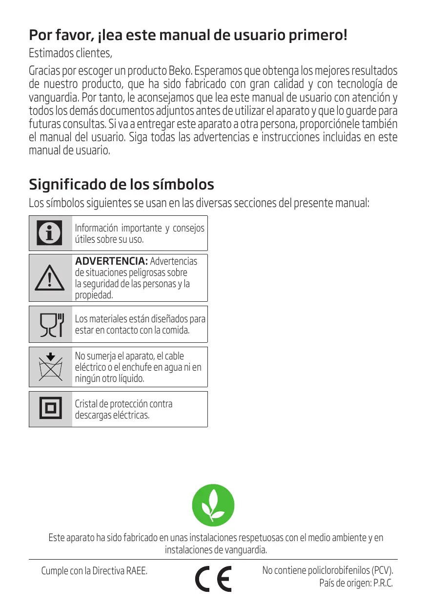 Gracias por escoger un producto Beko. Esperamos que obtenga los mejores resultados de nuestro producto, que ha sido fabricado con gran calidad y con tecnología de vanguardia. Por tanto, le aconsejamos que lea este manual de usuario con atención y todos los demás documentos adjuntos antes de utilizar el aparato y que lo guarde para futuras consultas. Si va a entregar este aparato a otra persona, proporciónele también el manual del usuario. Siga todas las advertencias e instrucciones incluidas en este manual de usuario.