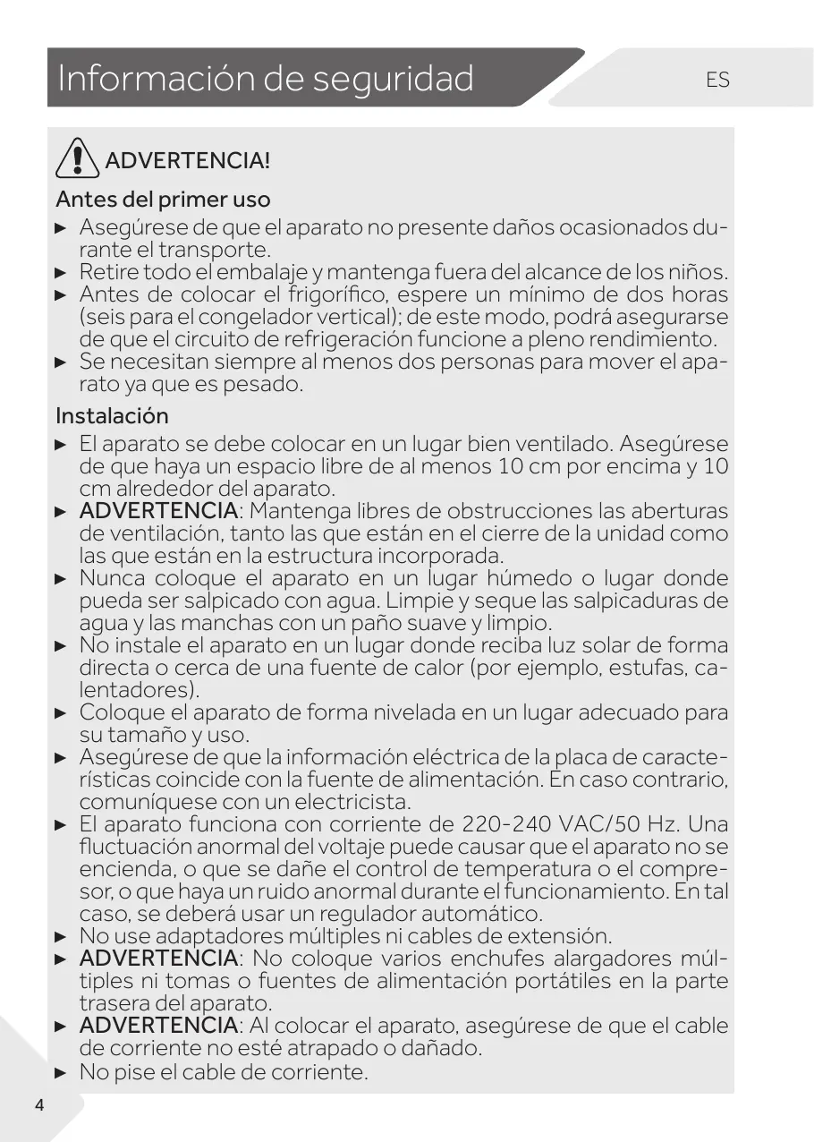 | Funciones principales | Frío ventilado, modo vacaciones, control de la humedad |