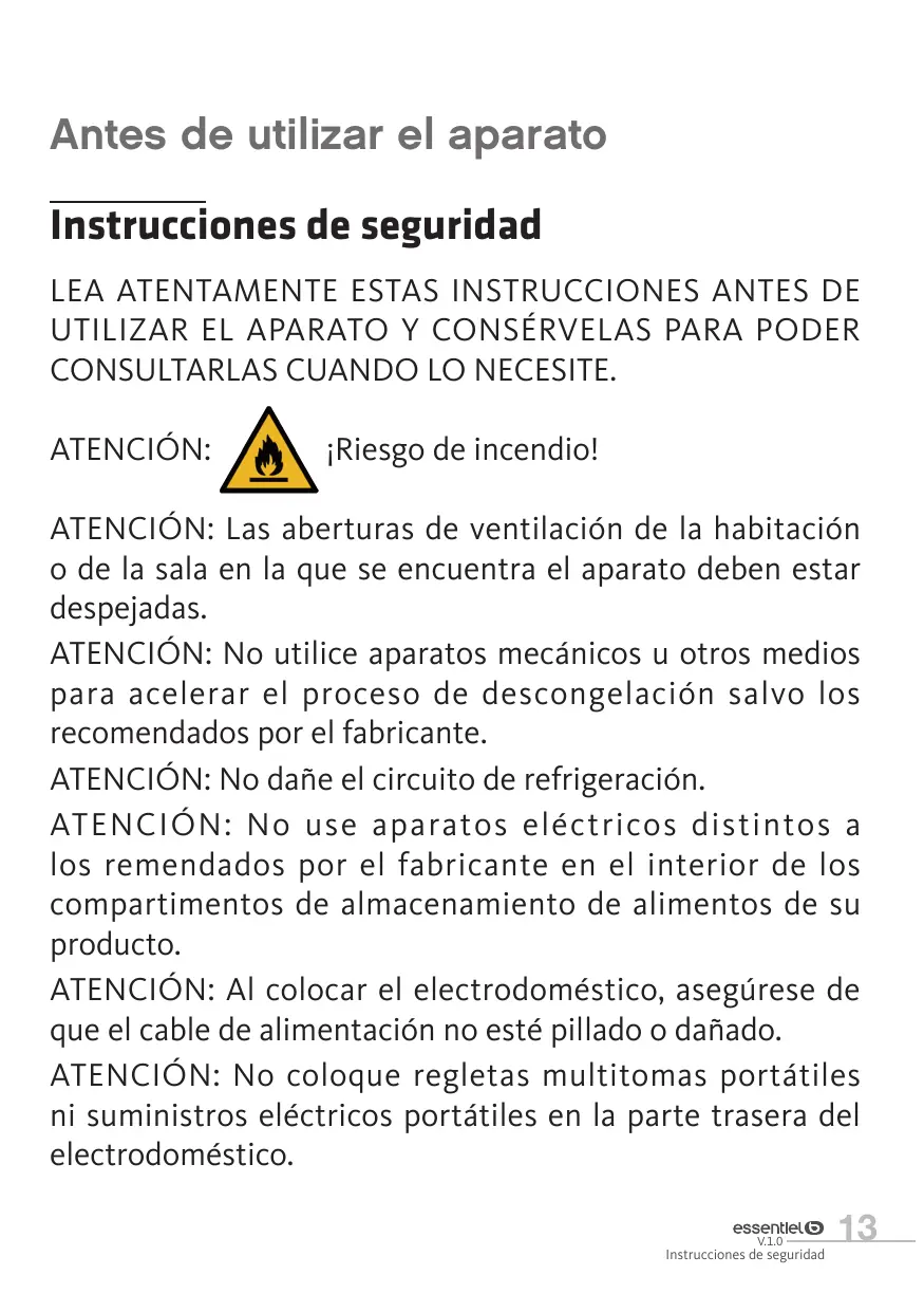 ATENCIÓN: No utilice aparatos mecánicos u otros medios para acelerar el proceso de descongelación salvo los recomendados por el fabricante. ATENCIÓN: No dañe el circuito de refrigeración. ATENCIÓN: No use aparatos eléctricos distintos a los remendados por el fabricante en el interior de los compartimentos de almacenamiento de alimentos de su producto. ATENCIÓN: Al colocar el electrodoméstico, asegúrese de que el cable de alimentación no esté pillado o dañado. ATENCIÓN: No coloque regletas multitomas portátiles ni suministros eléctricos portátiles en la parte trasera del electrodoméstico. V.1.0