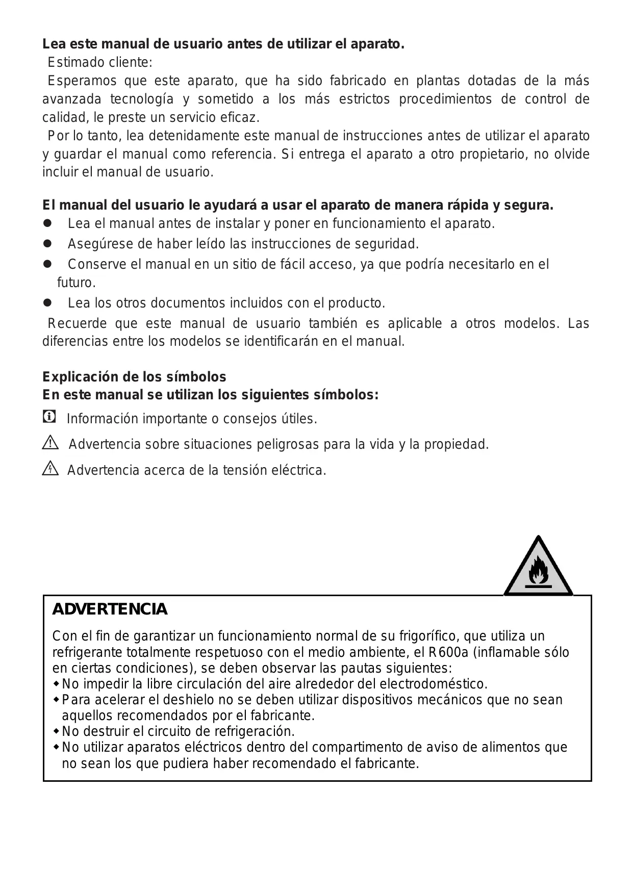 Lea este manual de usuario antes de utilizar el aparato. Estimado cliente: Esperamos que este aparato, que ha sido fabricado en plantas dotadas de la más avanzada tecnología y sometido a los más estrictos procedimientos de control de calidad, le preste un servicio eficaz. Por lo tanto, lea detenidamente este manual de instrucciones antes de utilizar el aparato y guardar el manual como referencia. Si entrega el aparato a otro propietario, no olvide incluir el manual de usuario. El manual del usuario le ayudará a usar el aparato de manera rápida y segura. Lea el manual antes de instalar y poner en funcionamiento el aparato. Asegúrese de haber leído las instrucciones de seguridad. Conserve el manual en un sitio de fácil acceso, ya que podría necesitarlo en el futuro. Lea los otros documentos incluidos con el producto. Recuerde que este manual de usuario también es aplicable a otros modelos. Las diferencias entre los modelos se identificarán en el manual. Explicación de los símbolos En este manual se utilizan los siguientes símbolos: Información importante o consejos útiles. Advertencia sobre situaciones peligrosas para la vida y la propiedad. Advertencia acerca de la tensión eléctrica.