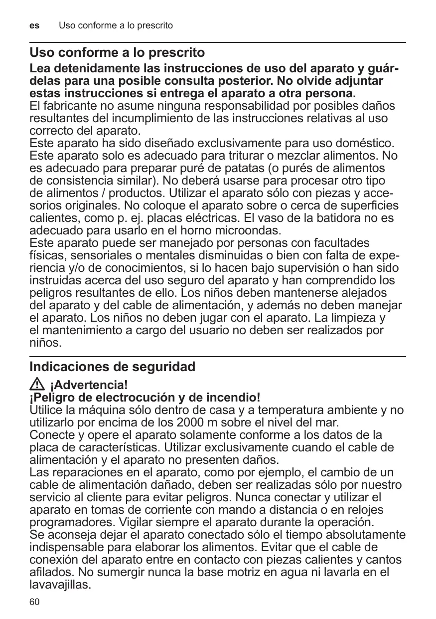 Lea detenidamente las instrucciones de uso del aparato y guárdelas para una posible consulta posterior. No olvide adjuntar estas instrucciones si entrega el aparato a otra persona. El fabricante no asume ninguna responsabilidad por posibles daños resultantes del incumplimiento de las instrucciones relativas al uso correcto del aparato. Este aparato ha sido diseñado exclusivamente para uso doméstico. Este aparato solo es adecuado para triturar o mezclar alimentos. No es adecuado para preparar puré de patatas (o purés de alimentos de consistencia similar). No deberá usarse para procesar otro tipo de alimentos / productos. Utilizar el aparato sólo con piezas y accesorios originales. No coloque el aparato sobre o cerca de superficies calientes, como p. ej. placas eléctricas. El vaso de la batidora no es adecuado para usarlo en el horno microondas. Este aparato puede ser manejado por personas con facultades físicas, sensoriales o mentales disminuidas o bien con falta de experiencia y/o de conocimientos, si lo hacen bajo supervisión o han sido instruidas acerca del uso seguro del aparato y han comprendido los peligros resultantes de ello. Los niños deben mantenerse alejados del aparato y del cable de alimentación, y además no deben manejar el aparato. Los niños no deben jugar con el aparato. La limpieza y el mantenimiento a cargo del usuario no deben ser realizados por niños.