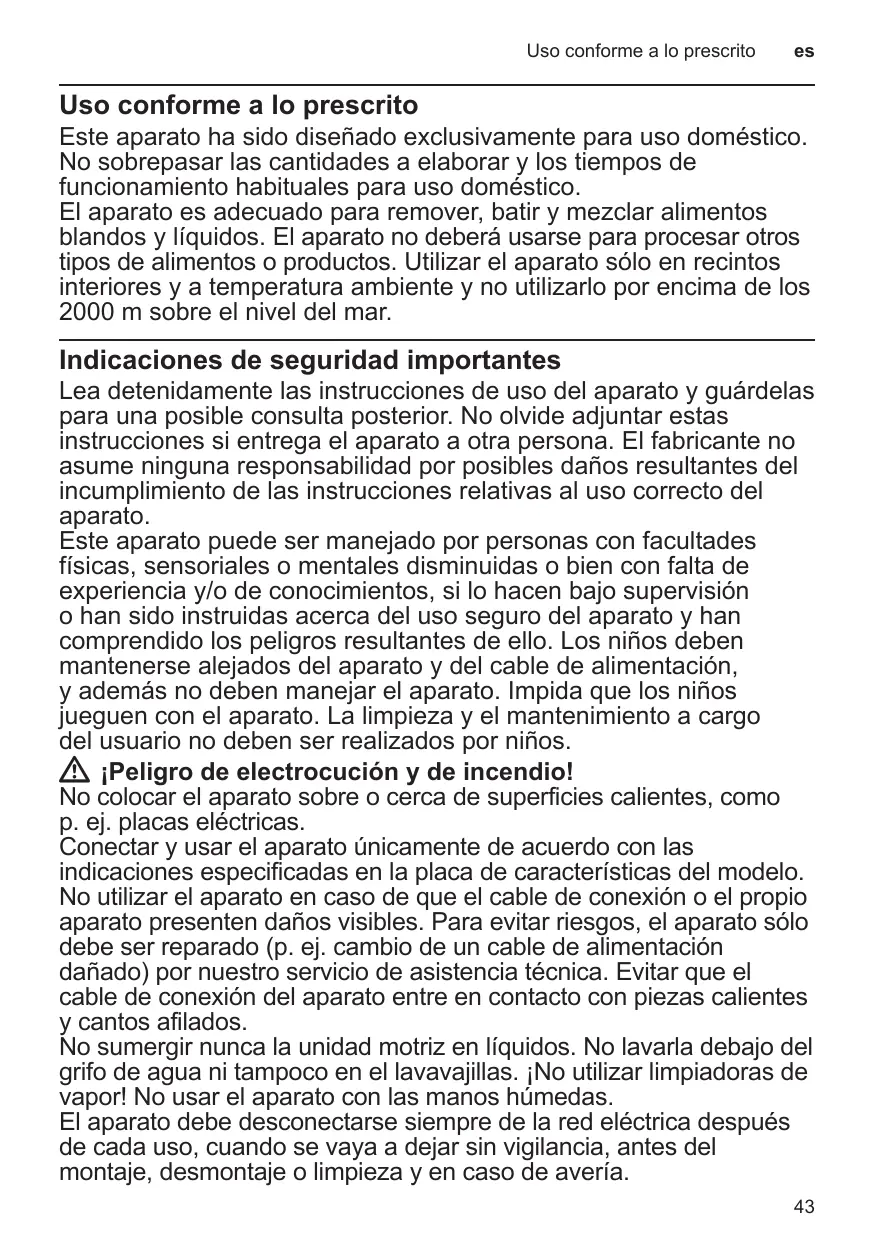 Este aparato puede ser manejado por personas con facultades físicas, sensoriales o mentales disminuidas o bien con falta de experiencia y/o de conocimientos, si lo hacen bajo supervisión o han sido instruidas acerca del uso seguro del aparato y han comprendido los peligros resultantes de ello. Los niños deben mantenerse alejados del aparato y del cable de alimentación, y además no deben manejar el aparato. Impida que los niños jueguen con el aparato. La limpieza y el mantenimiento a cargo del usuario no deben ser realizados por niños. W ¡Peligro de electrocución y de incendio! No colocar el aparato sobre o cerca de superficies calientes, como p. ej. placas eléctricas. Conectar y usar el aparato únicamente de acuerdo con las indicaciones especificadas en la placa de características del modelo. No utilizar el aparato en caso de que el cable de conexión o el propio aparato presenten daños visibles. Para evitar riesgos, el aparato sólo debe ser reparado (p. ej. cambio de un cable de alimentación dañado) por nuestro servicio de asistencia técnica. Evitar que el cable de conexión del aparato entre en contacto con piezas calientes y cantos afilados. No sumergir nunca la unidad motriz en líquidos. No lavarla debajo del grifo de agua ni tampoco en el lavavajillas. ¡No utilizar limpiadoras de vapor! No usar el aparato con las manos húmedas. El aparato debe desconectarse siempre de la red eléctrica después de cada uso, cuando se vaya a dejar sin vigilancia, antes del montaje, desmontaje o limpieza y en caso de avería. 43