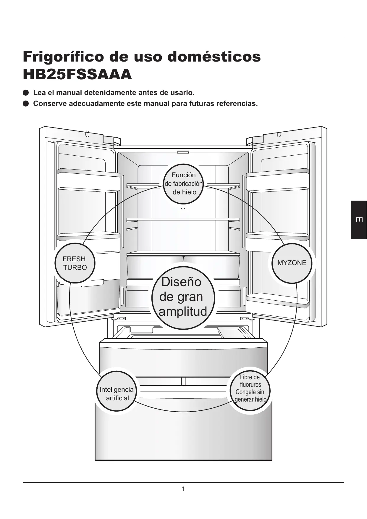 HB25FSSAAA es un frigorífico doméstico de doble puerta de estilo francés. Lea este manual detenidamente como ayuda para usar este producto con seguridad y comodidad. Para usar este producto de forma segura, lea las instrucciones de seguridad detenidamente antes de usar el producto.