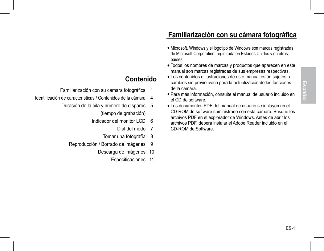 Familiarización con su cámara fotográfica Familiarización con su cámara fotográfica Identificación de características / Contenidos de la cámara Duración de la pila y número de disparos (tiempo de grabación) Indicador del monitor LCD Dial del modo Tomar una fotografía Reproducción / Borrado de imágenes Descarga de imágenes Especificaciones