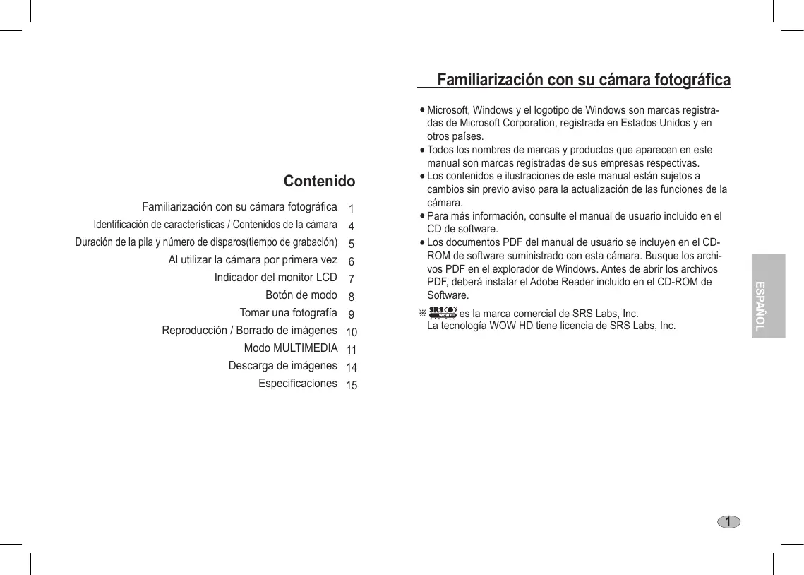 ESPAÑOL Familiarización con su cámara fotográfica Identificación de características / Contenidos de la cámara Duración de la pila y número de disparos(tiempo de grabación) Al utilizar la cámara por primera vez Indicador del monitor LCD Botón de modo Tomar una fotografía Reproducción / Borrado de imágenes Modo MULTIMEDIA Descarga de imágenes å Microsoft, Windows y el logotipo de Windows son marcas registradas de Microsoft Corporation, registrada en Estados Unidos y en otros países. å Todos los nombres de marcas y productos que aparecen en este manual son marcas registradas de sus empresas respectivas. å Los contenidos e ilustraciones de este manual están sujetos a cambios sin previo aviso para la actualización de las funciones de la cámara. å Para más información, consulte el manual de usuario incluido en el CD de software. å Los documentos PDF del manual de usuario se incluyen en el CDROM de software suministrado con esta cámara. Busque los archivos PDF en el explorador de Windows. Antes de abrir los archivos PDF, deberá instalar el Adobe Reader incluido en el CD-ROM de Software. Familiarización con su cámara fotográfica PELIGRO ADVERTENCIA PELIGRO indica una situación peligrosa inminente que, si no se evita, provocará la muerte o heridas graves. ADVERTENCIA indica una situación de riesgo potencial que, si no se evita, podría ocasionar la muerte o una lesión grave. No intente realizar ninguna modificación en esta cámara. Esto podría ocasionar un incendio, lesiones, descargas eléctricas o daños en la cámara. La inspección interna, el mantenimiento y las reparaciones deben ser llevadas a cabo por su distribuidor o su Centro de servicios Samsung Camera. Si algún líquido u objeto extraño llegara a entrar en la cámara, no la use. Apague la cámara y enseguida desconecte la fuente de alimentación (las pilas o el Adaptador de CA). Debe ponerse en contacto con su distribuidor o Centro de Servicios Samsung Camera. No siga utilizando la cámara, ya que puede provocar incendios o descargas eléctricas.