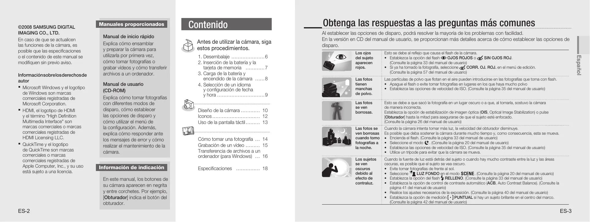 - QuickTime y el logotipo de QuickTime son marcas comerciales o marcas comerciales registradas de Apple Computer, Inc., y su uso está sujeto a una licencia. Manuales proporcionados Manual de inicio rápido Explica cómo ensamblar y preparar la cámara para utilizarla por primera vez, cómo tomar fotografías o grabar vídeos y cómo transferir archivos a un ordenador. Manual de usuario (CD-ROM) Explica cómo tomar fotografías con diferentes modos de disparo, cómo establecer las opciones de disparo y cómo utilizar el menú de la configuración. Además, explica cómo responder ante los mensajes de error y cómo realizar el mantenimiento de la cámara. Información de indicación En este manual, los botones de su cámara aparecen en negrita y entre corchetes. Por ejemplo, [Obturador] indica el botón del obturador. ES-2 Contenido Antes de utilizar la cámara, siga estos procedimientos.