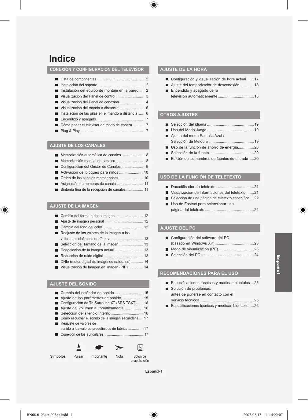 Pulse el botón EXIT para salir. Español-20 BN68-01234A-00Spa.indd 20 2007-02-13 4:22:28 Decodificador de teletexto Muchos canales de Televisor incluyen “teletexto”, páginas de información escrita que proporciona datos como: Horas de los programas de televisión Boletines de noticias y partes meteorológicos Resultados deportivos ubtítulos para sordos Las páginas de teletexto se organizan en seis categorías : Parte Contenido