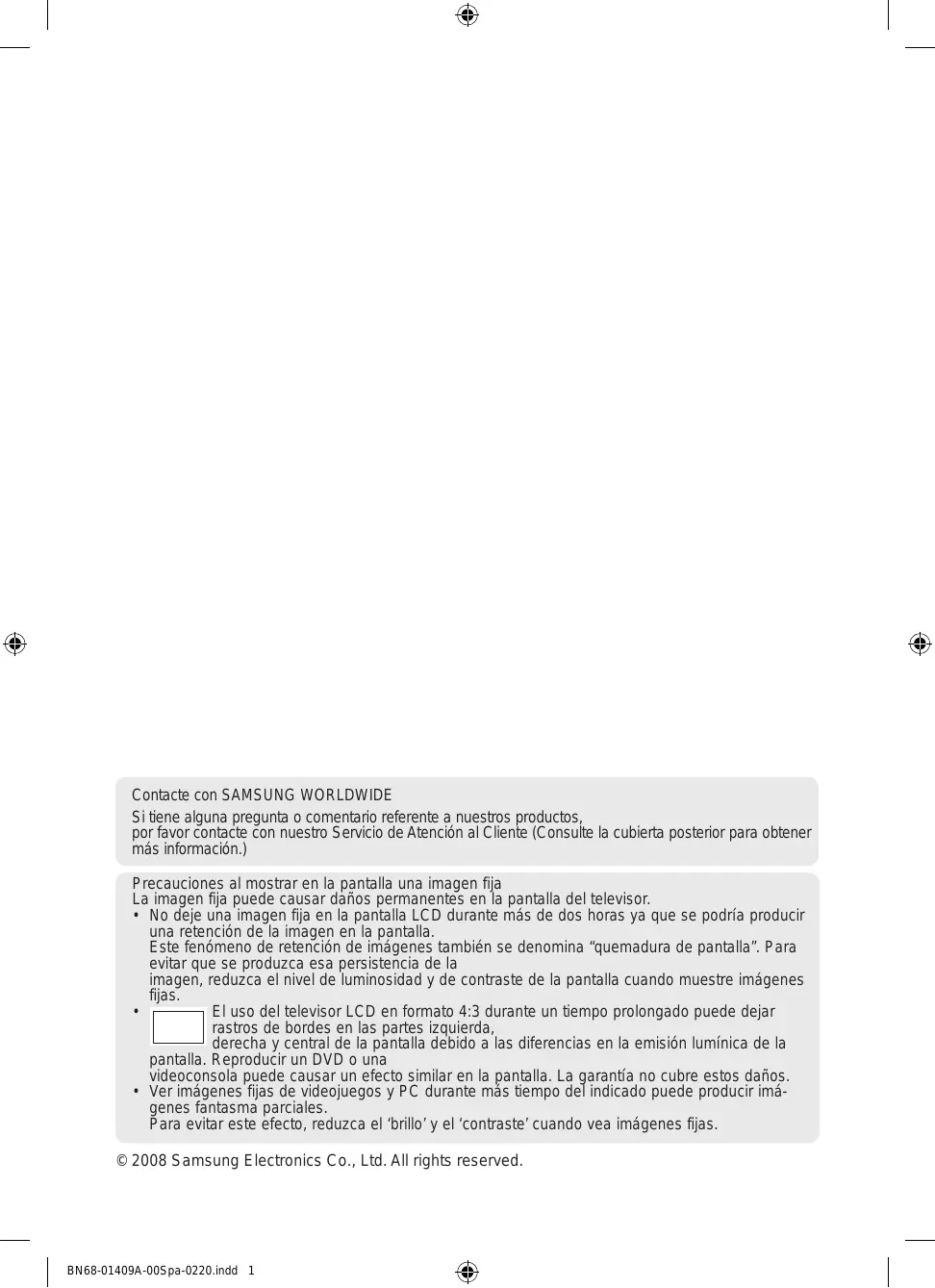 - Ver imágenes fijas de videojuegos y PC durante más tiempo del indicado puede producir imágenes fantasma parciales. Para evitar este efecto, reduzca el ‘brillo’ y el ‘contraste’ cuando vea imágenes fijas. © 2008 Samsung Electronics Co., Ltd. All rights reserved. BN68-01409A-00Spa-0220.indd 1 Contenido CONEXIÓN Y PREPARACIÓN DEL TV