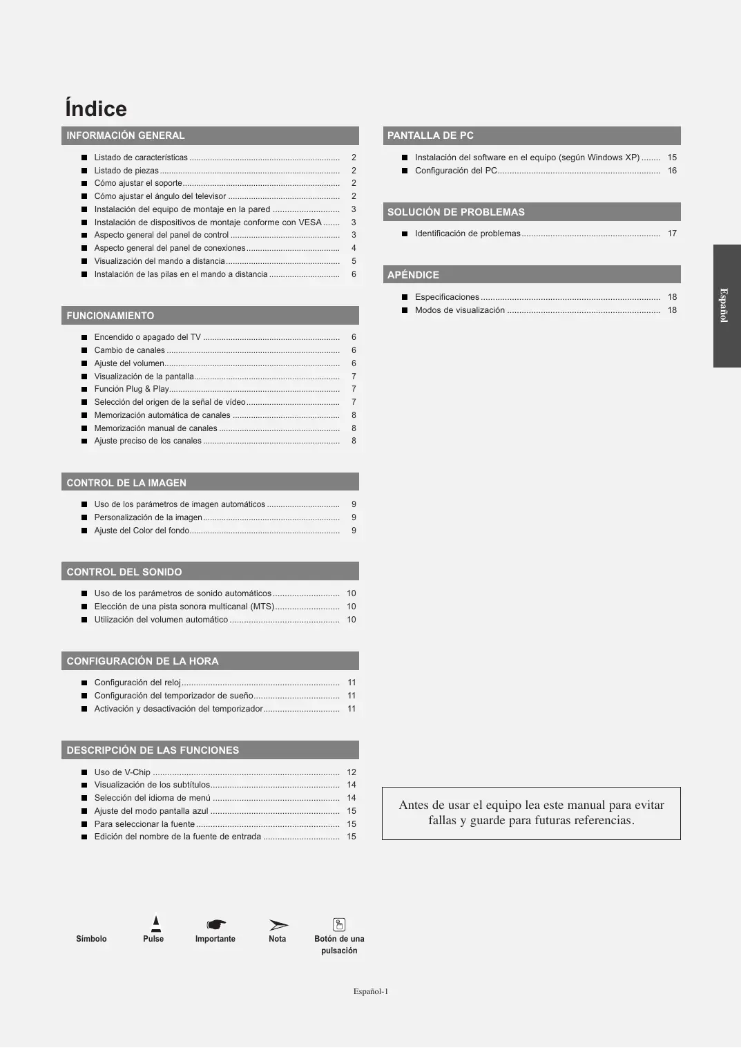 Uso de V-Chip .............................................................................. Visualización de los subtítulos...................................................... Selección del idioma de menú ..................................................... Ajuste del modo pantalla azul ...................................................... Para seleccionar la fuente ............................................................ Edición del nombre de la fuente de entrada ................................ Símbolo Pulse Importante Nota
