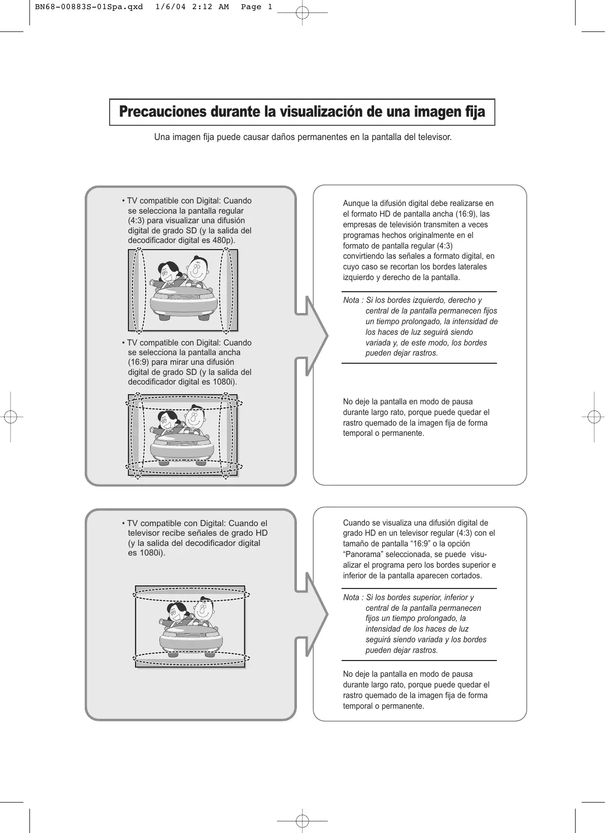 - TV compatible con Digital: Cuando el televisor recibe señales de grado HD (y la salida del decodificador digital es 1080i). Cuando se visualiza una difusión digital de grado HD en un televisor regular (4:3) con el tamaño de pantalla “16:9” o la opción “Panorama” seleccionada, se puede visualizar el programa pero los bordes superior e inferior de la pantalla aparecen cortados. Nota : Si los bordes superior, inferior y central de la pantalla permanecen fijos un tiempo prolongado, la intensidad de los haces de luz seguirá siendo variada y los bordes pueden dejar rastros. No deje la pantalla en modo de pausa durante largo rato, porque puede quedar el rastro quemado de la imagen fija de forma temporal o permanente. BN68-00883S-01Spa.qxd 1/6/04 2:12 AM Page 2