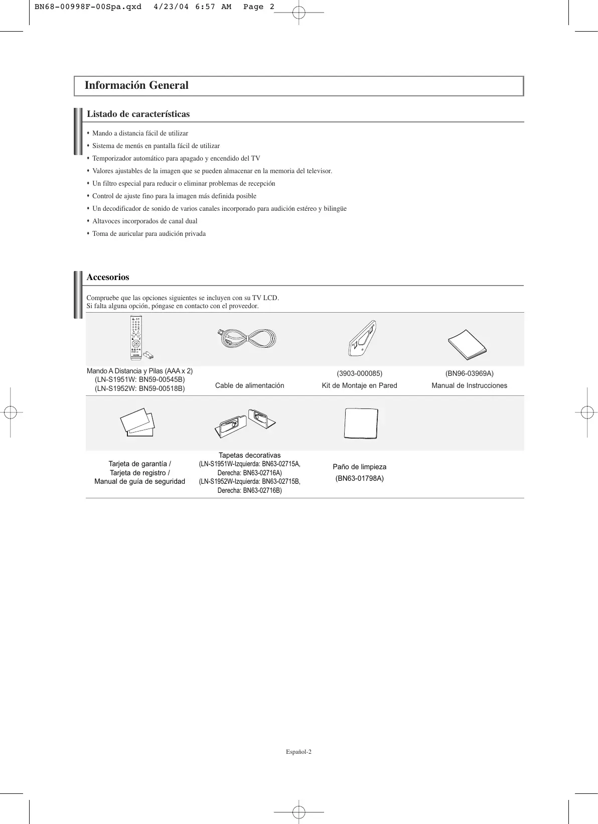 Español Configuración del reloj.................................................................. 17 Configuración del temporizador de sueño.................................... 17 Activación y desactivación del temporizador................................ 17 CONEXIONES BN68-00998F-00Spa.qxd 4/23/04 6:57 AM Page 2 Información General Listado de características Mando a distancia fácil de utilizar Sistema de menús en pantalla fácil de utilizar Temporizador automático para apagado y encendido del TV Valores ajustables de la imagen que se pueden almacenar en la memoria del televisor. Un filtro especial para reducir o eliminar problemas de recepción Control de ajuste fino para la imagen más definida posible Un decodificador de sonido de varios canales incorporado para audición estéreo y bilingüe Altavoces incorporados de canal dual Toma de auricular para audición privada Accesorios Compruebe que las opciones siguientes se incluyen con su TV LCD. Si falta alguna opción, póngase en contacto con el proveedor. Tarjeta de garantía / Tarjeta de registro / Manual de guía de seguridad Cable de alimentación Tapetas decorativas (LN-S1951W-Izquierda: BN63-02715A, Derecha: BN63-02716A) (LN-S1952W-Izquierda: BN63-02715B, Derecha: BN63-02716B) Español-2 (3903-000085) (BN96-03969A) Kit de Montaje en Pared Manual de Instrucciones Paño de limpieza (BN63-01798A) BN68-00998F-00Spa.qxd 4/21/04 6:54 PM Page 3 Aspecto general del panel de control Los botones del panel (inferior derecha) controlan las funciones básicas del TV, incluyendo los menús en pantalla. Para usar las funciones más avanzadas, debe usar el mando a distancia. El color y la forma del producto pueden variar según el modelo. SOURCE Cambia entre todas las fuentes de entrada disponibles. (TV, AV, S-Vídeo, Componente, PC, DVI). En el menú de la pantalla, utilice este botón del mismo modo del mando a distancia. que el botón ENTER MENU Pulse para ver en pantalla un menú con las características del TV. Pulse para aumentar o reducir el volumen. En el menú de la pantalla, utilice los botones del mismo modo que los botones y del mando a distancia. Pulse para cambiar de canal. En el menú de la pantalla, utilice estos botones del mismo modo que los botones y del mando a distancia. Español-3 ALTAVOCES (ENCENDIDO) Pulse para encender o apagar el TV.