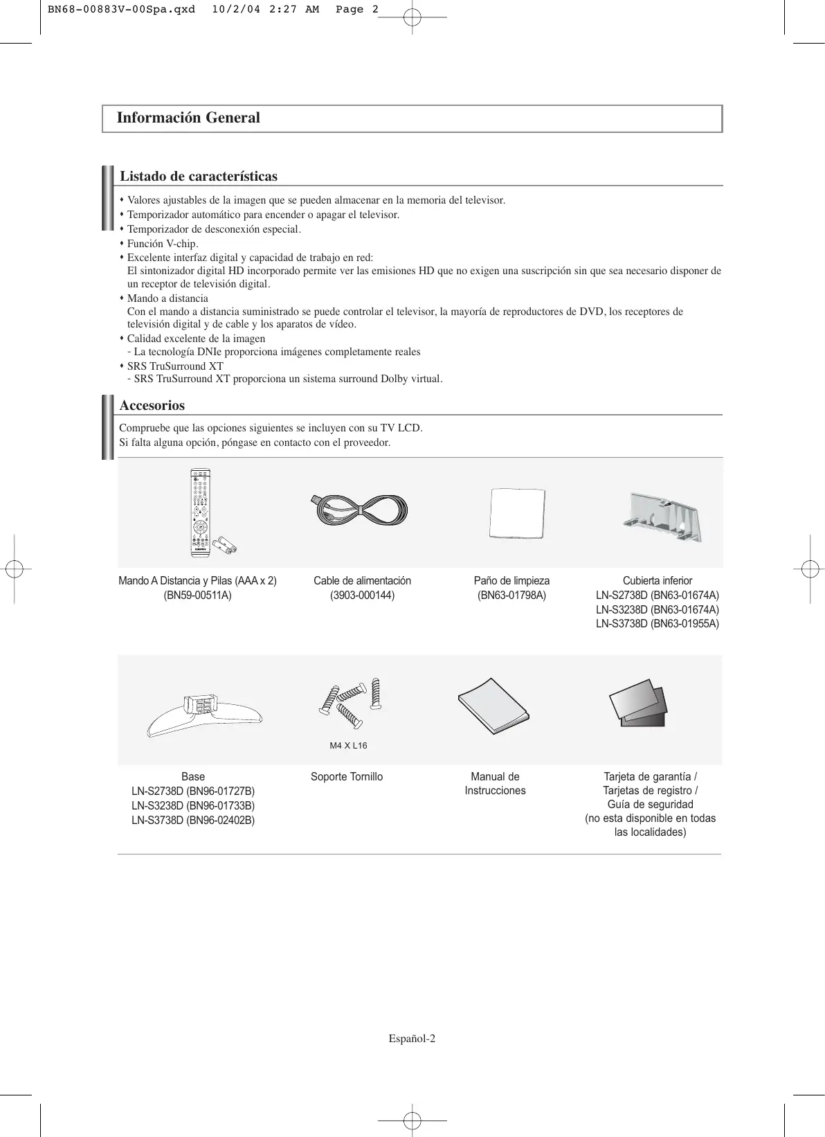 BN68-00883V-00Spa.qxd 10/2/04 2:27 AM Page 2 Información General Listado de características Valores ajustables de la imagen que se pueden almacenar en la memoria del televisor. Temporizador automático para encender o apagar el televisor. Temporizador de desconexión especial. Función V-chip. Excelente interfaz digital y capacidad de trabajo en red: El sintonizador digital HD incorporado permite ver las emisiones HD que no exigen una suscripción sin que sea necesario disponer de un receptor de televisión digital. Mando a distancia Con el mando a distancia suministrado se puede controlar el televisor, la mayoría de reproductores de DVD, los receptores de televisión digital y de cable y los aparatos de vídeo. Calidad excelente de la imagen - La tecnología DNIe proporciona imágenes completamente reales SRS TruSurround XT - SRS TruSurround XT proporciona un sistema surround Dolby virtual. Accesorios Compruebe que las opciones siguientes se incluyen con su TV LCD. Si falta alguna opción, póngase en contacto con el proveedor. Mando A Distancia y Pilas (AAA x 2) (BN59-00511A) Cable de alimentación (3903-000144) Paño de limpieza (BN63-01798A) Manual de Instrucciones Español-2 Tarjeta de garantía / Tarjetas de registro / Guía de seguridad (no esta disponible en todas las localidades) BN68-00883V-00Spa.qxd 10/2/04 2:27 AM Page 3 Aspecto general del panel de control Botones de la parte inferior derecha del panel Los botones del panel inferior derecho controlan las funciones básicas del televisor, incluido el menú en pantalla. Para usar las funciones más avanzadas, debe usar el mando a distancia. El color y la forma del producto pueden variar según el modelo. SOURCE Cambia entre todas las fuentes de entrada disponibles (TV, AV1, AV2, S-Video1, S-Video2, Componente, PC, HDMI1, HDMI2). En el menú de la pantalla, utilice este botón del mismo modo que el botón ENTER del mando a distancia. El modelo de 27 pulgadas sólo admite TV, AV, S-Video, Componente, PC, HDMI1 y HDMI2. MENU Pulse para ver en pantalla un menú con las características del TV. Pulse para aumentar o reducir el volumen. En el menú de la pantalla, utilice los botones del mismo modo que los botones y del mando a distancia. Español-3 Pulse para cambiar de canal. En el menú de la pantalla, utilice estos botones del mismo modo que los botones y del mando a distancia. (Encendido) Pulse para encender o apagar el TV. Indicador De Alimentación Parpadea y se apaga cuando se enciende el aparato y se ilumina en el modo en espera. Sensor del mando a distancia Dirija el mando a distancia hacia este punto del TV. Altavoces BN68-00883V-00Spa.qxd 10/2/04 2:27 AM Page 4 Aspecto general del panel de conexiones Conectores del panel posterior Se pueden usar para conectar componentes de A/V que estarán conectados permanentemente, como reproductores de vídeo o de DVD. Si precisa información sobre la conexión de equipos, consulte las páginas 7 a 12. LN-S2738D LN-S3238D LN-S3738D El color y la forma del producto pueden variar según el modelo. AV IN1 Entradas de vídeo y audio para dispositivos externos, como una videocámara o un reproductor de vídeo. S-VIDEO 1 Permite conectar la señal de S-Vídeo de una cámara o de un vídeo. AUDIO OUT Conéctelo a la toma de la entrada de audio del amplificador/sistema de Cine en casa. DIGITAL AUDIO OUT (OPTICAL) Se conecta al componente de audio digital. SERVICE 1/SERVICE 2 Conector solamente para servicio. HDMI/DVI IN 1, 2 / DVI IN (R-AUDIO-L) Conéctela a la toma HDMI de un dispositivo que tenga salida HDMI. Use el terminal HDMI/DVI para conectar el DVI a un dispositivo externo. Debe usar el cable de DVI a HDMI o el adaptador de DVI-HDMI (DVI a HDMI) para la conexion y el terminal “R-AUDIO-L” de DVI-IN para la salida de sonido. - El terminal HDMI/DVI IN no es compatible con el PC. - No se necesita conexión de sonido alguna para una conexión de HDMI a HDMI. Español-4 TOMA DE AURICULARES (LN-S2738D) Efectuar una conexión de un conjunto de auriculares exteriores para la audición individual.