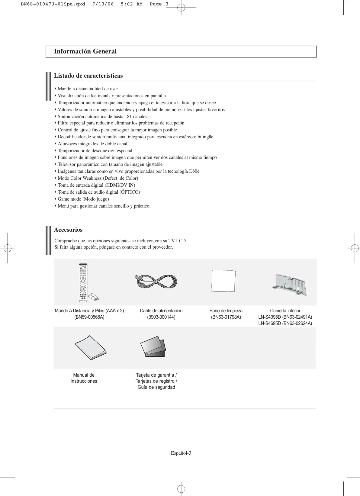 BN68-01047J-01Spa.qxd 7/13/06 5:02 AM Page 3 Información General Listado de características Mando a distancia fácil de usar Visualización de los menús y presentaciones en pantalla Temporizador automático que enciende y apaga el televisor a la hora que se desee Valores de sonido e imagen ajustables y posibilidad de memorizar los ajustes favoritos Sintonización automática de hasta 181 canales. Filtro especial para reducir o eliminar los problemas de recepción Control de ajuste fino para conseguir la mejor imagen posible Decodificador de sonido multicanal integrado para escucha en estéreo o bilingüe Altavoces integrados de doble canal Temporizador de desconexión especial Funciones de imagen sobre imagen que permiten ver dos canales al mismo tiempo Televisor panorámico con tamaño de imagen ajustable Imágenes tan claras como en vivo proporcionadas por la tecnología DNle Modo Color Weakness (Defect. de Color) Toma de entrada digital (HDMI/DV IN) Toma de salida de audio digital (ÓPTICO) Game mode (Modo juego) Menú para gestionar canales sencillo y práctico. Accesorios Compruebe que las opciones siguientes se incluyen con su TV LCD. Si falta alguna opción, póngase en contacto con el proveedor. Mando A Distancia y Pilas (AAA x 2) (BN59-00568A) Manual de Instrucciones Cable de alimentación (3903-000144) Tarjeta de garantía / Tarjetas de registro / Guía de seguridad Español-3 Paño de limpieza (BN63-01798A) Aspecto general del panel de control Botones de la parte inferior derecha del panel Los botones del panel inferior derecho controlan las funciones básicas del televisor, incluido el menú en pantalla. Para usar las funciones más avanzadas, debe usar el mando a distancia. El color y la forma del producto pueden variar según el modelo. SOURCE Cambia entre todas las fuentes de entrada disponibles (TV, AV1, AV2, S-Video1, S-Video2, Componente1, Componente2, PC, HDMI1, HDMI2). En el menú de la pantalla, utilice este botón del mismo del mando a distancia. modo que el botón ENTER Pulse para cambiar de canal. En el menú de la pantalla, utilice estos botones del mismo modo que los botones y del mando a distancia. MENU Pulse para ver en pantalla un menú con las características del TV. (POWER) Pulse para encender o apagar el TV. Pulse para aumentar o reducir el volumen. En el menú de la pantalla, utilice los botones del mismo modo que los botones y del mando a distancia. Español-4 ALTAVOCES