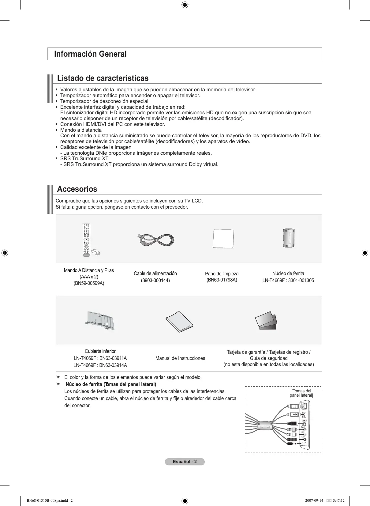 - Ver imágenes fijas de videojuegos y PC durante más tiempo del indicado puede producir restos de imágenes parciales. Para evitar este efecto, reduzca el ‘brillo’ y el ‘contraste’ cuando vea imágenes fijas. © 2007 Samsung Electronics Co., Ltd. All rights reserved. BN68-01310B-00Spa.indd 1 2007-09-14 3:47:10 Contenido Información General