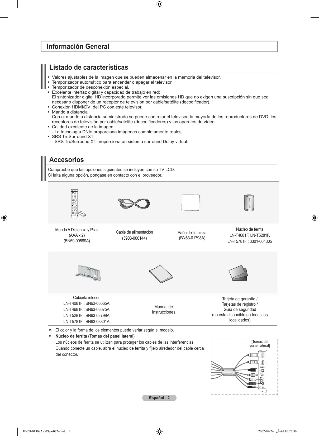 - Ver imágenes fijas de videojuegos y PC durante más tiempo del indicado puede producir restos de imágenes parciales. Para evitar este efecto, reduzca el ‘brillo’ y el ‘contraste’ cuando vea imágenes fijas. © 2007 Samsung Electronics Co., Ltd. All rights reserved. BN68-01308A-00Spa-0723.indd 1 2007-07-23 ¿ÀÈÄ 2:09:40 Contenido Información General