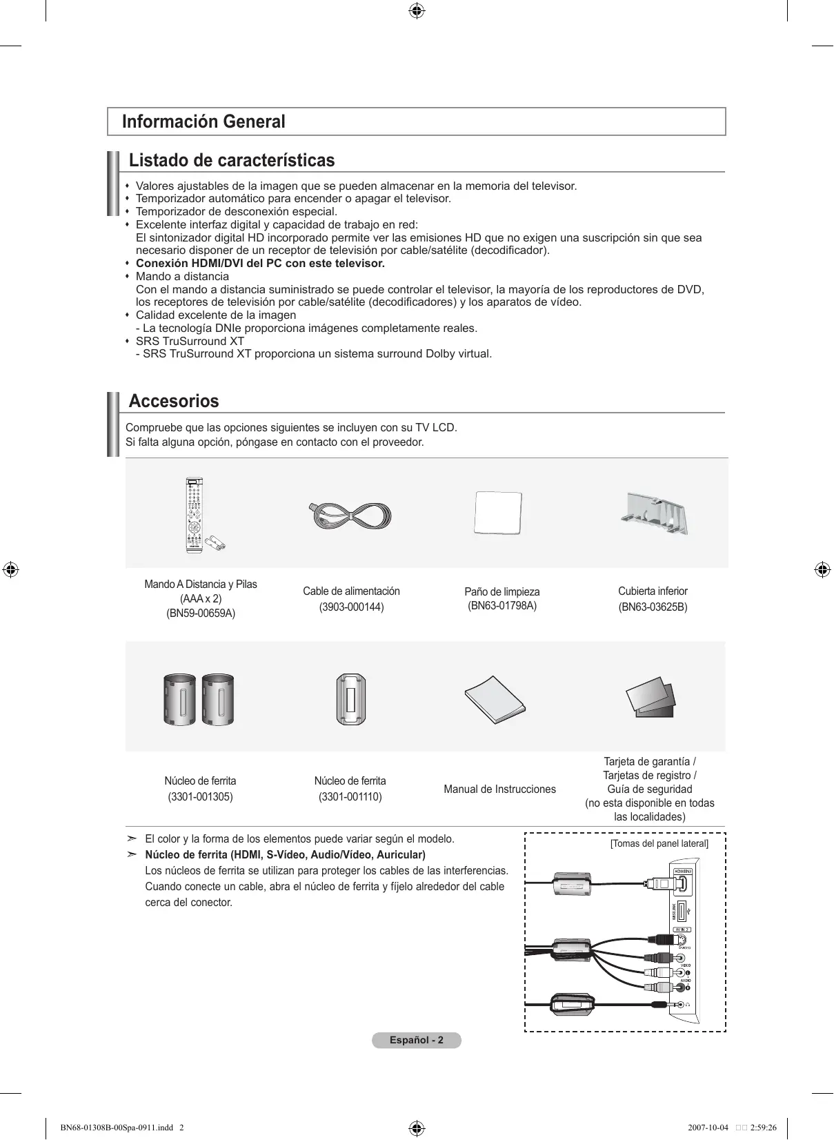 - Ver imágenes fijas de videojuegos y PC durante más tiempo del indicado puede producir restos de imágenes parciales. Para evitar este efecto, reduzca el ‘brillo’ y el ‘contraste’ cuando vea imágenes fijas. © 2007 Samsung Electronics Co., Ltd. All rights reserved. BN68-01308B-00Spa-0911.indd 1 2007-10-04 2:59:24 Contenido Información General