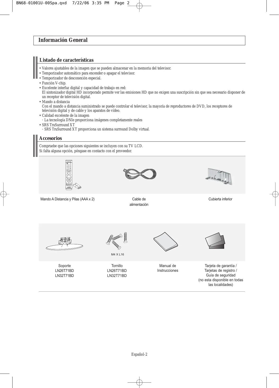 BN68-01001U-00Spa.qxd 7/22/06 3:35 PM Page 2 Información General Listado de características Valores ajustables de la imagen que se pueden almacenar en la memoria del televisor. Temporizador automático para encender o apagar el televisor. Temporizador de desconexión especial. Función V-chip. Excelente interfaz digital y capacidad de trabajo en red: El sintonizador digital HD incorporado permite ver las emisiones HD que no exigen una suscripción sin que sea necesario disponer de un receptor de televisión digital. Mando a distancia Con el mando a distancia suministrado se puede controlar el televisor, la mayoría de reproductores de DVD, los receptores de televisión digital y de cable y los aparatos de vídeo. Calidad excelente de la imagen - La tecnología DNIe proporciona imágenes completamente reales SRS TruSurround XT - SRS TruSurround XT proporciona un sistema surround Dolby virtual. Accesorios Compruebe que las opciones siguientes se incluyen con su TV LCD. Si falta alguna opción, póngase en contacto con el proveedor. Mando A Distancia y Pilas (AAA x 2) Cable de alimentación Cubierta inferior M4 X L16 Manual de Instrucciones Español-2 Tarjeta de garantía / Tarjetas de registro / Guía de seguridad (no esta disponible en todas las localidades) BN68-01001U-00Spa.qxd 7/22/06 11:15 AM Page 3 Aspecto general del panel de control Botones de la parte inferior derecha del panel Los botones del panel inferior derecho controlan las funciones básicas del televisor, incluido el menú en pantalla. Para usar las funciones más avanzadas, debe usar el mando a distancia. El color y la forma del producto pueden variar según el modelo. SOURCE Cambia entre todas las fuentes de entrada disponibles (TV, AV1, AV2, S-Video1, S-Video2, Componente, PC, HDMI1, HDMI2). En el menú de la pantalla, utilice este botón del mismo modo que el botón ENTER del mando a distancia. El modelo de 26 pulgadas sólo admite TV, AV, S-Video, Component, PC, HDMI1 y HDMI2 MENU Pulse para ver en pantalla un menú con las características del TV. Pulse para cambiar de canal. En el menú de la pantalla, utilice estos botones del mismo modo que los botones y del mando a distancia. ALTAVOCES