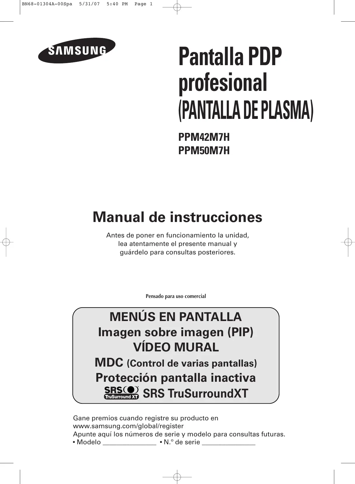MDC (Control de varias pantallas) Protección pantalla inactiva SRS TruSurroundXT Gane premios cuando registre su producto en www.samsung.com/global/register Apunte aquí los números de serie y modelo para consultas futuras. Modelo ________________ N.º de serie ________________