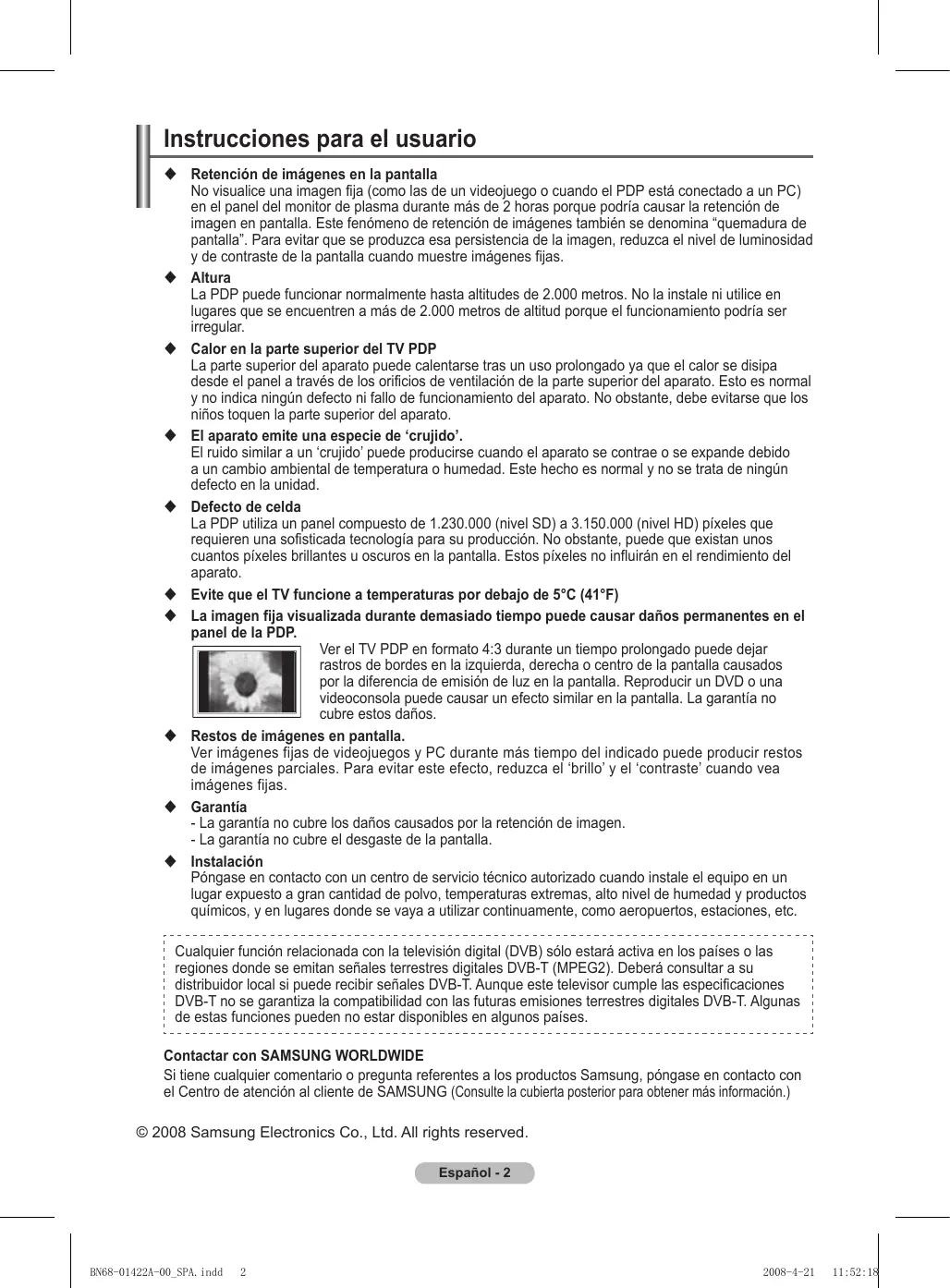 Dispositivo Anynet+ 1 Dispositivo Anynet+ 2 Instrucciones para el usuario Retención de imágenes en la pantalla No visualice una imagen fija (como las de un videojuego o cuando el PDP está conectado a un PC) en el panel del monitor de plasma durante más de 2 horas porque podría causar la retención de imagen en pantalla. Este fenómeno de retención de imágenes también se denomina “quemadura de pantalla”. Para evitar que se produzca esa persistencia de la imagen, reduzca el nivel de luminosidad y de contraste de la pantalla cuando muestre imágenes fijas. Altura La PDP puede funcionar normalmente hasta altitudes de 2.000 metros. No la instale ni utilice en lugares que se encuentren a más de 2.000 metros de altitud porque el funcionamiento podría ser irregular. Calor en la parte superior del TV PDP La parte superior del aparato puede calentarse tras un uso prolongado ya que el calor se disipa desde el panel a través de los orificios de ventilación de la parte superior del aparato. Esto es normal y no indica ningún defecto ni fallo de funcionamiento del aparato. No obstante, debe evitarse que los niños toquen la parte superior del aparato. El aparato emite una especie de ‘crujido’. El ruido similar a un ‘crujido’ puede producirse cuando el aparato se contrae o se expande debido a un cambio ambiental de temperatura o humedad. Este hecho es normal y no se trata de ningún defecto en la unidad. Defecto de celda La PDP utiliza un panel compuesto de 1.230.000 (nivel SD) a 3.150.000 (nivel HD) píxeles que requieren una sofisticada tecnología para su producción. No obstante, puede que existan unos cuantos píxeles brillantes u oscuros en la pantalla. Estos píxeles no influirán en el rendimiento del aparato. Evite que el TV funcione a temperaturas por debajo de 5°C (41°F) La imagen fija visualizada durante demasiado tiempo puede causar daños permanentes en el panel de la PDP. Ver el TV PDP en formato 4:3 durante un tiempo prolongado puede dejar rastros de bordes en la izquierda, derecha o centro de la pantalla causados por la diferencia de emisión de luz en la pantalla. Reproducir un DVD o una videoconsola puede causar un efecto similar en la pantalla. La garantía no cubre estos daños. Restos de imágenes en pantalla. Ver imágenes fijas de videojuegos y PC durante más tiempo del indicado puede producir restos de imágenes parciales. Para evitar este efecto, reduzca el ‘brillo’ y el ‘contraste’ cuando vea imágenes fijas. Garantía - La garantía no cubre los daños causados por la retención de imagen. - La garantía no cubre el desgaste de la pantalla. Instalación Póngase en contacto con un centro de servicio técnico autorizado cuando instale el equipo en un lugar expuesto a gran cantidad de polvo, temperaturas extremas, alto nivel de humedad y productos químicos, y en lugares donde se vaya a utilizar continuamente, como aeropuertos, estaciones, etc. Cualquier función relacionada con la televisión digital (DVB) sólo estará activa en los países o las regiones donde se emitan señales terrestres digitales DVB-T (MPEG2). Deberá consultar a su distribuidor local si puede recibir señales DVB-T. Aunque este televisor cumple las especificaciones DVB-T no se garantiza la compatibilidad con las futuras emisiones terrestres digitales DVB-T. Algunas de estas funciones pueden no estar disponibles en algunos países. Contactar con SAMSUNG WORLDWIDE Si tiene cualquier comentario o pregunta referentes a los productos Samsung, póngase en contacto con el Centro de atención al cliente de SAMSUNG (Consulte la cubierta posterior para obtener más información.) © 2008 Samsung Electronics Co., Ltd. All rights reserved. Español - BN68-01422A-00_SPA.indd