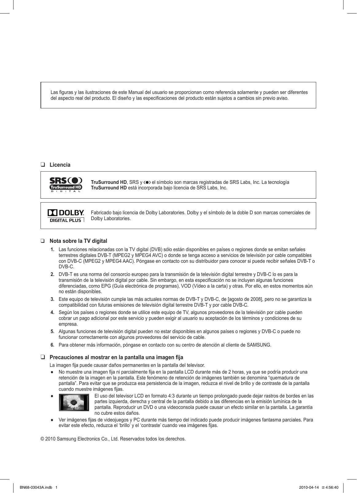 Las figuras y las ilustraciones de este Manual del usuario se proporcionan como referencia solamente y pueden ser diferentes del aspecto real del producto. El diseño y las especificaciones del producto están sujetos a cambios sin previo aviso. ❑❑ Licencia TruSurround HD, SRS y el símbolo son marcas registradas de SRS Labs, Inc. La tecnología TruSurround HD está incorporada bajo licencia de SRS Labs, Inc. Fabricado bajo licencia de Dolby Laboratories. Dolby y el símbolo de la doble D son marcas comerciales de Dolby Laboratories. ❑❑ Nota sobre la TV digital 1. Las funciones relacionadas con la TV digital (DVB) sólo están disponibles en países o regiones donde se emitan señales terrestres digitales DVB-T (MPEG2 y MPEG4 AVC) o donde se tenga acceso a servicios de televisión por cable compatibles con DVB-C (MPEG2 y MPEG4 AAC). Póngase en contacto con su distribuidor para conocer si puede recibir señales DVB-T o DVB-C.