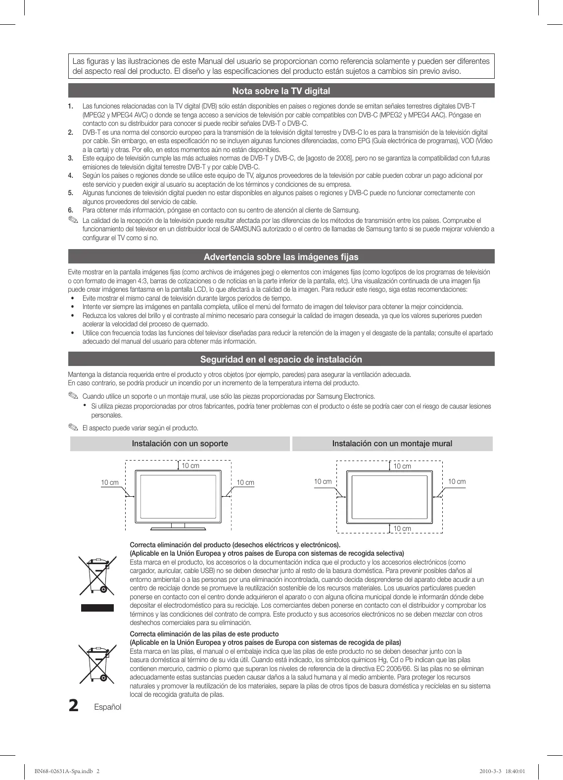 Correcta eliminación de las pilas de este producto (Aplicable en la Unión Europea y otros países de Europa con sistemas de recogida de pilas) Esta marca en las pilas, el manual o el embalaje indica que las pilas de este producto no se deben desechar junto con la basura doméstica al término de su vida útil. Cuando está indicado, los símbolos químicos Hg, Cd o Pb indican que las pilas contienen mercurio, cadmio o plomo que superan los niveles de referencia de la directiva EC 2006/66. Si las pilas no se eliminan adecuadamente estas sustancias pueden causar daños a la salud humana y al medio ambiente. Para proteger los recursos naturales y promover la reutilización de los materiales, separe la pilas de otros tipos de basura doméstica y recíclelas en su sistema local de recogida gratuita de pilas. Español BN68-02631A-Spa.indb 2 2010-3-3 18:40:01 Contenido Introducción